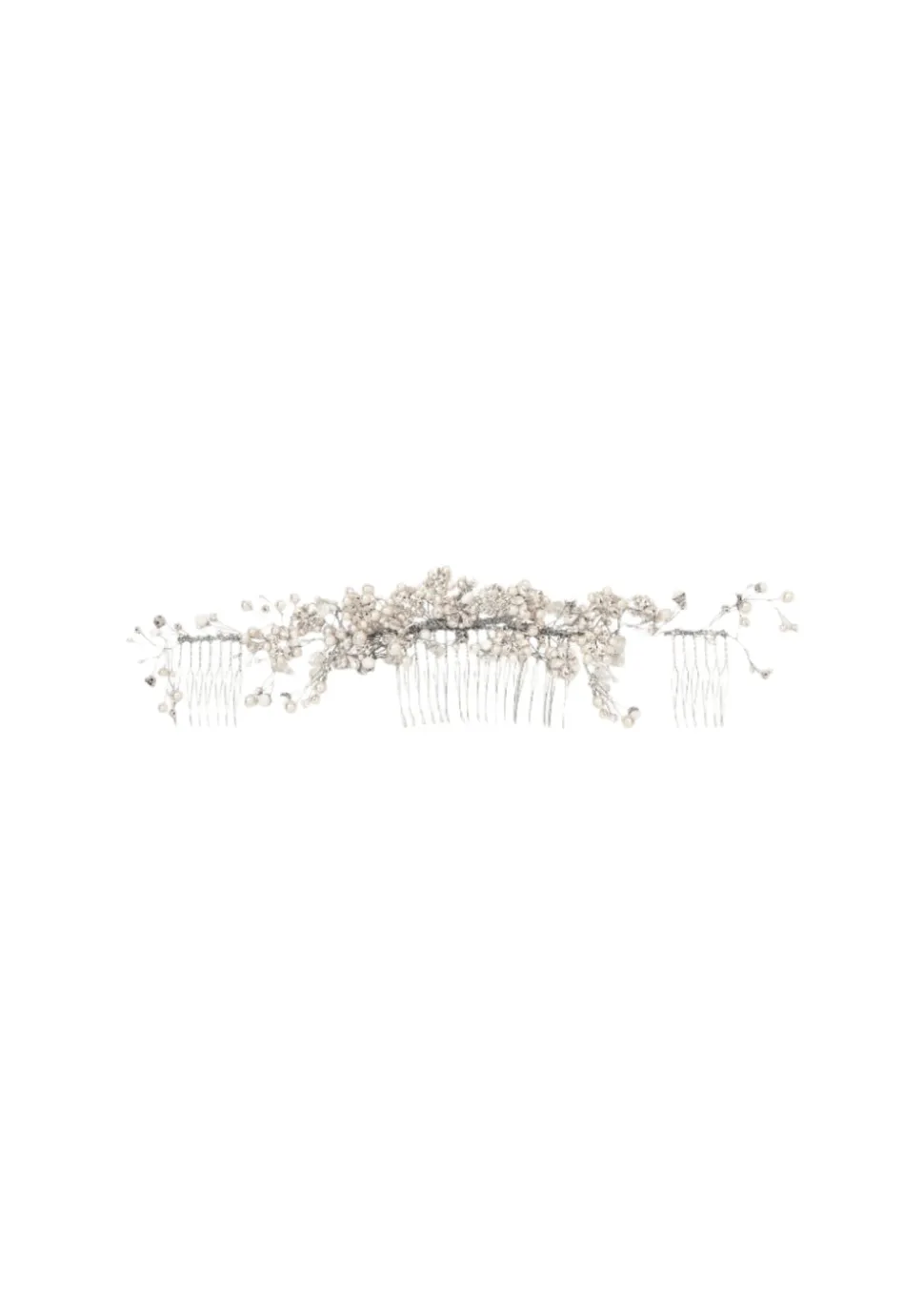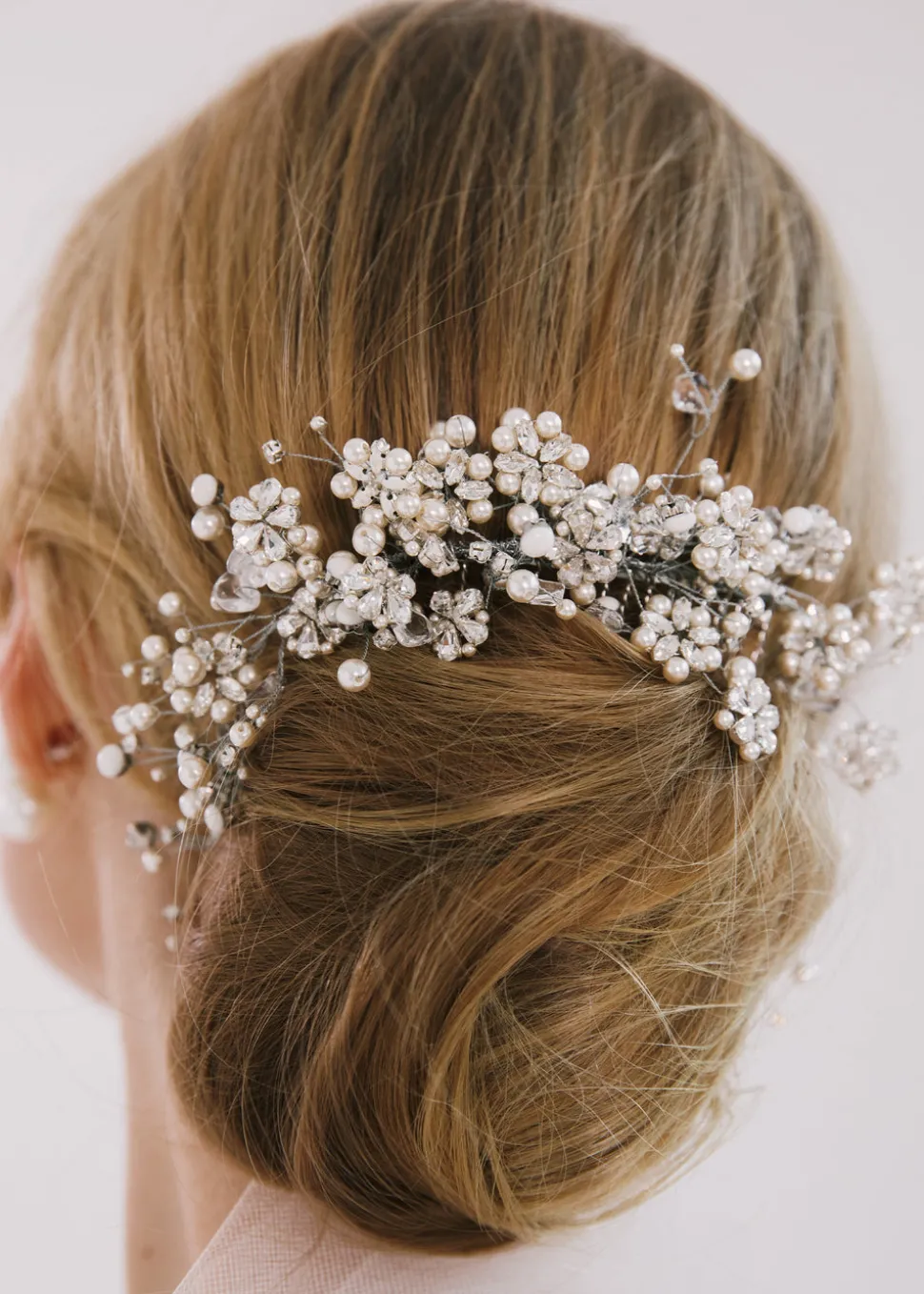 The Nicola Comb in Crystal Pearl is finished in New York of Fine Indian hand spun wire embroidery attached, on a steel comb, which is designed to stay firmly in place, once other pins have the hairstyle securely fastened.