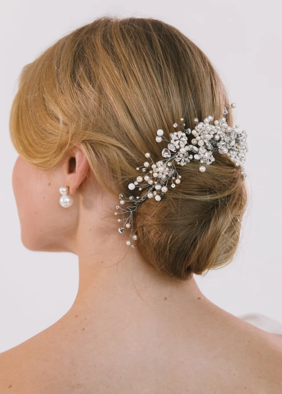 “Everything has a story to tell,” says Jennifer Behr, the founder of her namesake luxury hair accessory brand that has blossomed into one of New York City’s foremost ateliers for jewelry, as well as bridal. In every crystal, pearl, and ribbon, you’ll find the utmost quality and a sense of romance, as each piece reveals a modern interpretation of centuries-old regalia. The Nicola Comb in Crystal Pearl evokes the look of baby’s breath tucked in the hair, but with a more elegant, lasting effect. Stunning Czech crystals in special cuts combine with pearl details to create the distinctly organic look of this floral swag. With a flexible spine that sits on multiple combs, this is a versatile headpiece that can be wrapped around a chignon, slipped into a French twist, and even doubles as a tiara, pinned at the top of the head.