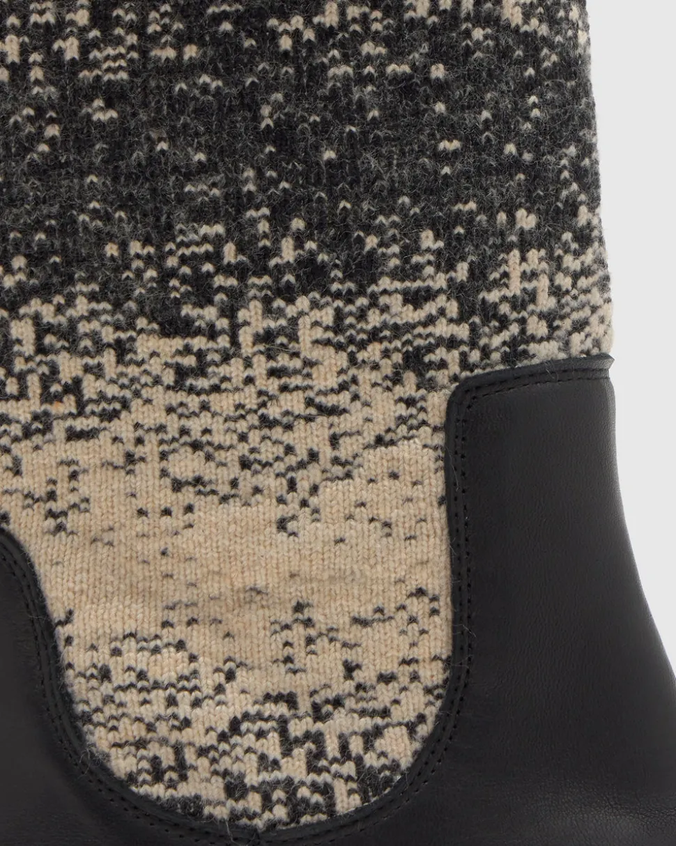 Founded in 1927, Castañer has elevated the espadrille into a sophisticated symbol of timeless design. With a commitment to craftsmanship, tradition, and natural materials, the brand continues to blend heritage with innovation, earning global recognition while staying true to its authentic roots. The Niebla in Black & Ecru offers a striking interpretation of the boot silhouette, crafted in nappa leather with a shaft in knit featuring a subtle dégradé effect. A gold-tone buckle detail, cushioned insole, and a 2.5″ wood-finish heel complete the design, blending artisanal texture with contemporary elegance.