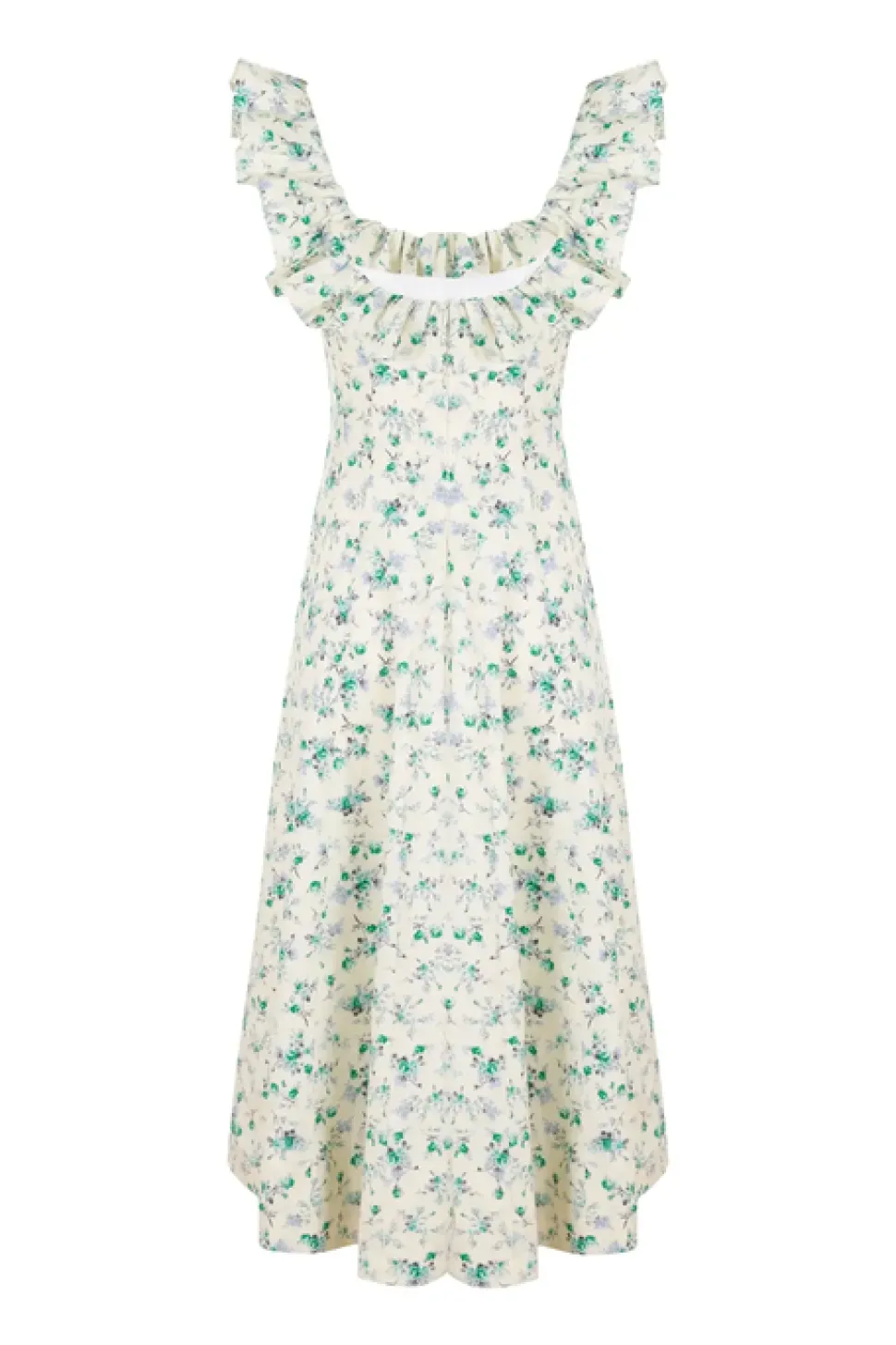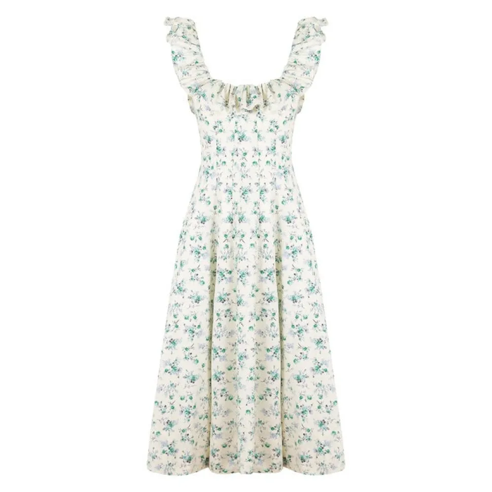Loulou, founder of Loulou La Dune, extends her refined feminine touch from interior design and tableware into the realm of ready-to-wear fashion. Recognizing the desire for beautifully crafted, effortless, and chic clothing, she has created a capsule collection that integrates elegance and ease into everyday wear. Experience effortless summer elegance with the Noemi Dress in Blue & Green Floral, exquisitely crafted from lightweight cotton. The long silhouette offers a flattering fit, while the ruffled square neck line adds a touch of elegance.