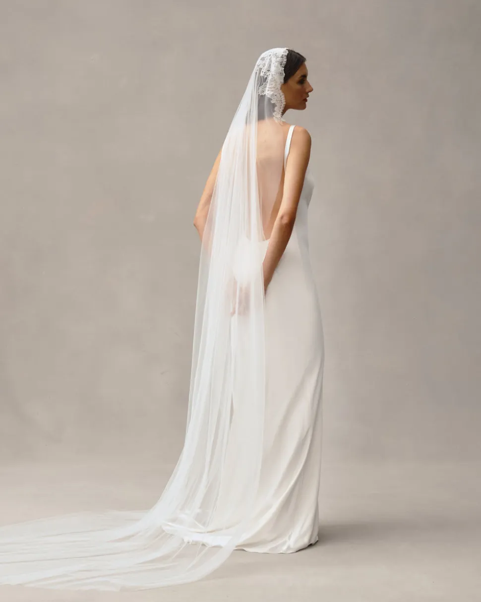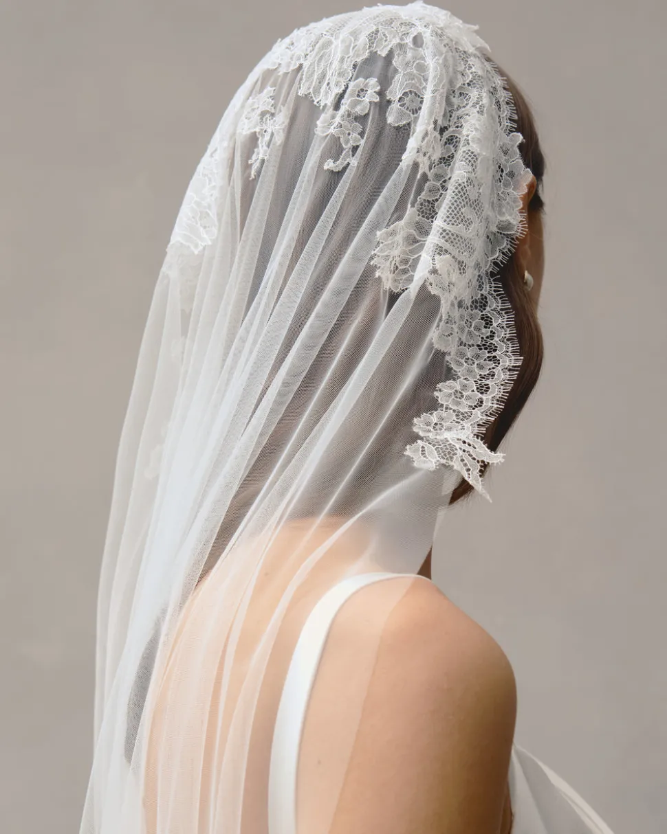 Famed for their comfort and wearability, Alexandra Grecco’s gowns and accessories find the balance between what is stylish and what is timeless. Handmade in New York’s garment district, these pieces embrace refinement and luxury from their graceful silhouettes to each immaculate detail. Romantic and ethereal, the Nora Veil is a mantilla-style veil adorned with a cluster chantilly lace at the crown of the head. Comb is attached to secure in place.