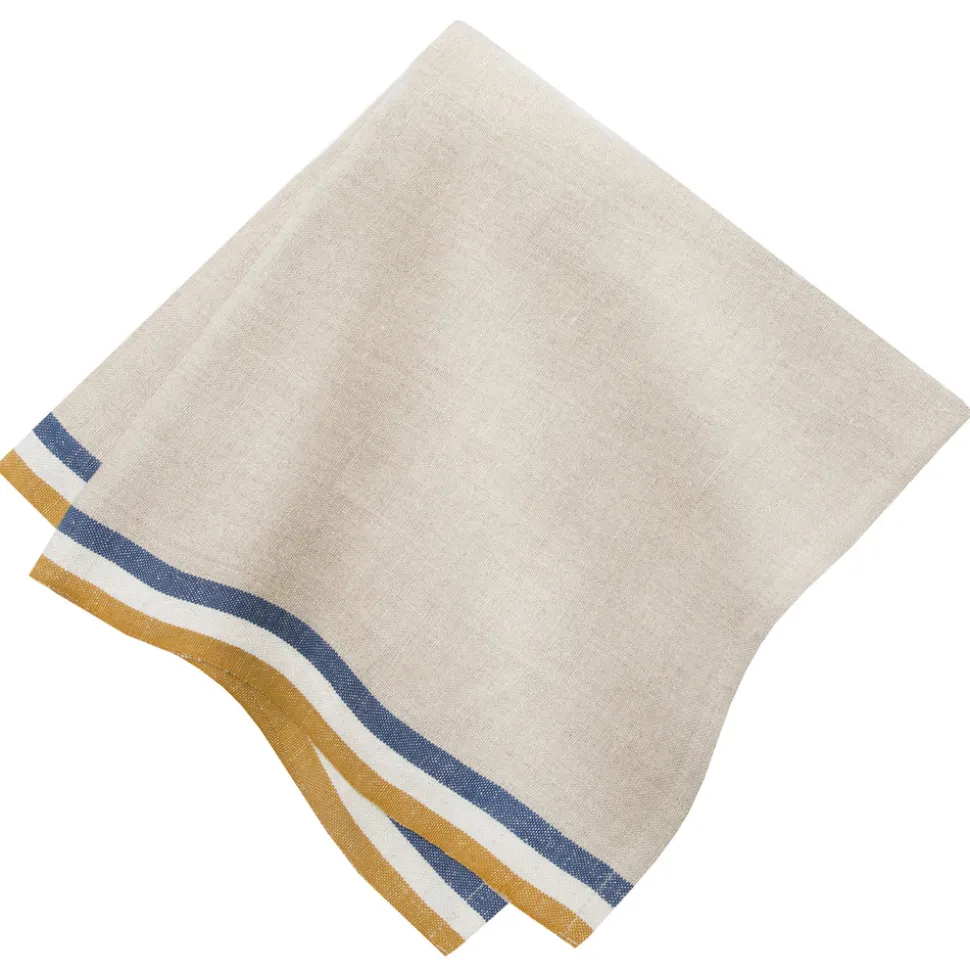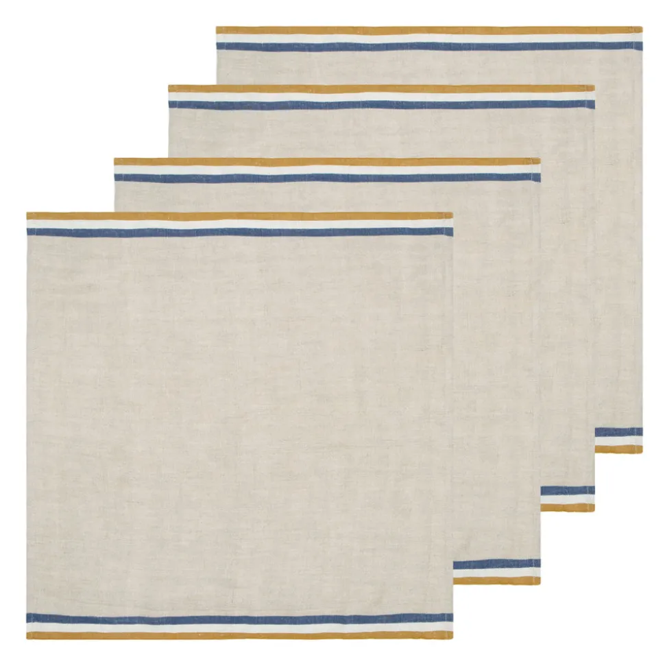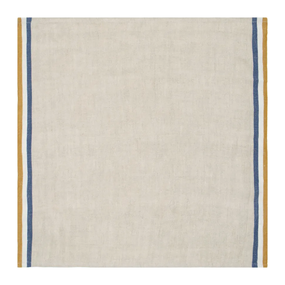 Inspired by stylistic trends from around the world, Caravan’s home accents embody an aesthetic that is both unique and unexpected, bringing everyday beauty and sophisticated simplicity to your home. The Normandy Napkins in Mustard, Natural & Blue Stripes, Set of 4 will have your guests dreaming of French culinary delights. They are fashioned from linen, which is entirely handmade from the spinning to weaving stage for a natural oh so feel good hand.