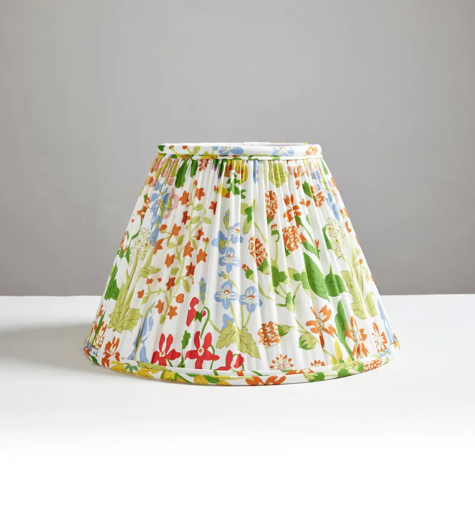 A destination for design connoisseurs since 1929, the House of Scalamandré is known for its commitment to the art and craftsmanship of its luxury fabric, wallcoverings, and furniture. Designs like the prancing zebras are recognized the world over for the integrity and quality of a brand in harmony with heritage and innovation. A beloved pattern from Grey Watkins decorates the Nymph Floral Pleated Shade, evoking the charm and delight of an English garden, with stylized foxgloves, wisteria, hydrangeas and more. Each shade is handcrafted by stretching and sewing the material over a wire frame; utterly elegant.