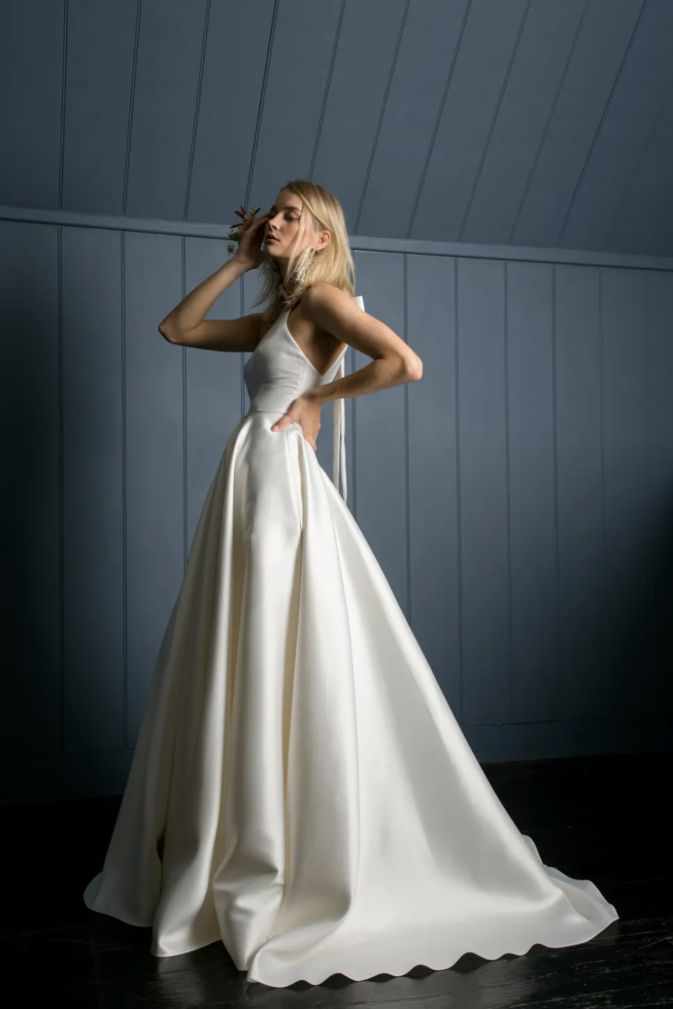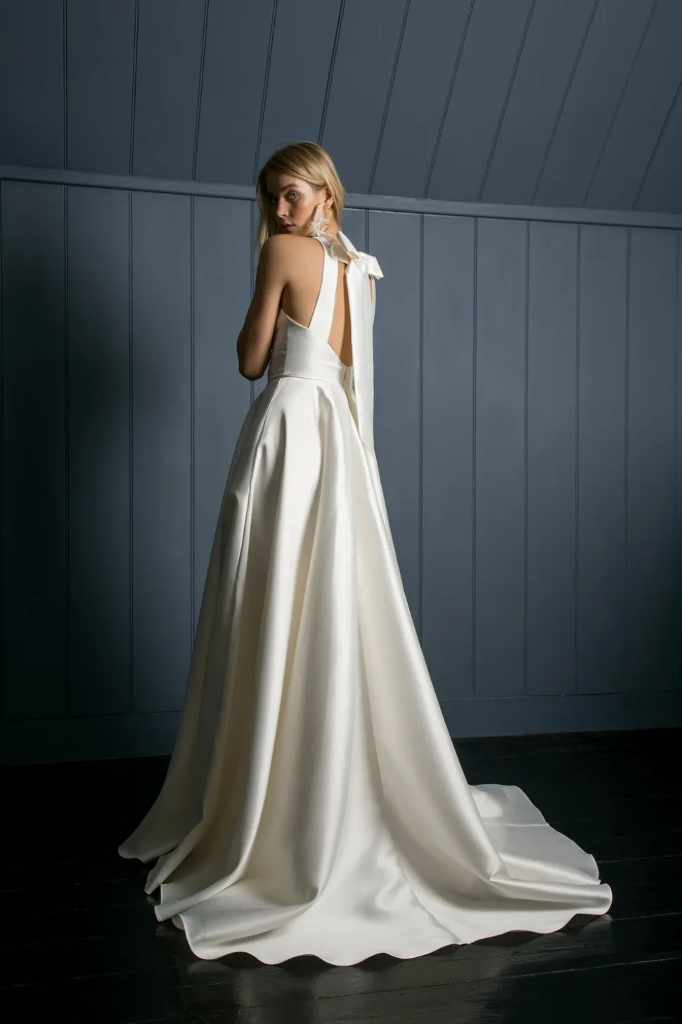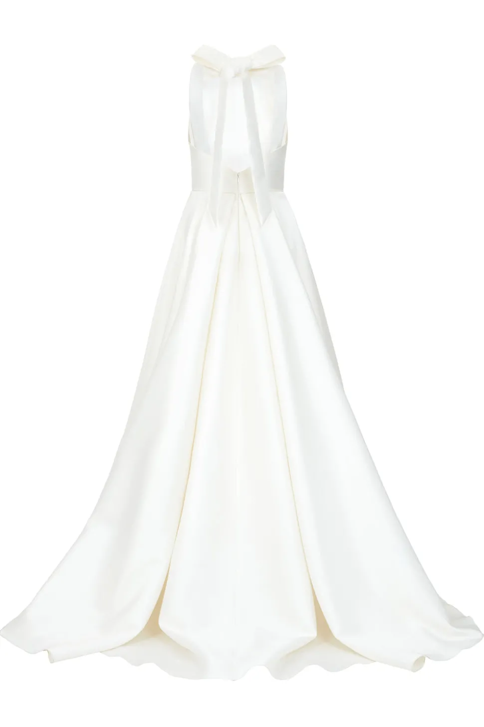 100% poly. Mikado ballgown with box-pleated skirt, pockets, and bow back detail. Made in London.