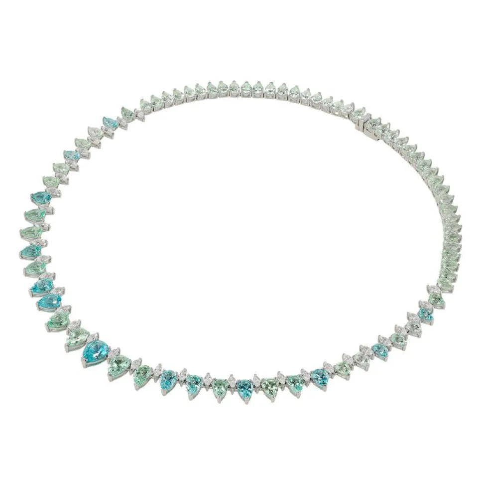 London-based Anabela Chan’s background in architecture and luxury fashion led to the first fine jewelry line to champion laboratory-grown gemstones. Today, its artisanal craftsmanship and sustainable innovations have found a place in the collections of royals, Rihanna, Taylor Swift, and sophisticated women worldwide. The Ocean Sapphire Infinity Necklace is a timeless piece in 18K white gold and rhodium vermeil, intricately hand-set with a graduating array of pear-cut laboratory-grown and created gemstones including pear-cut blue and green sapphires, with marquise and baguette-cut simulated white diamonds.