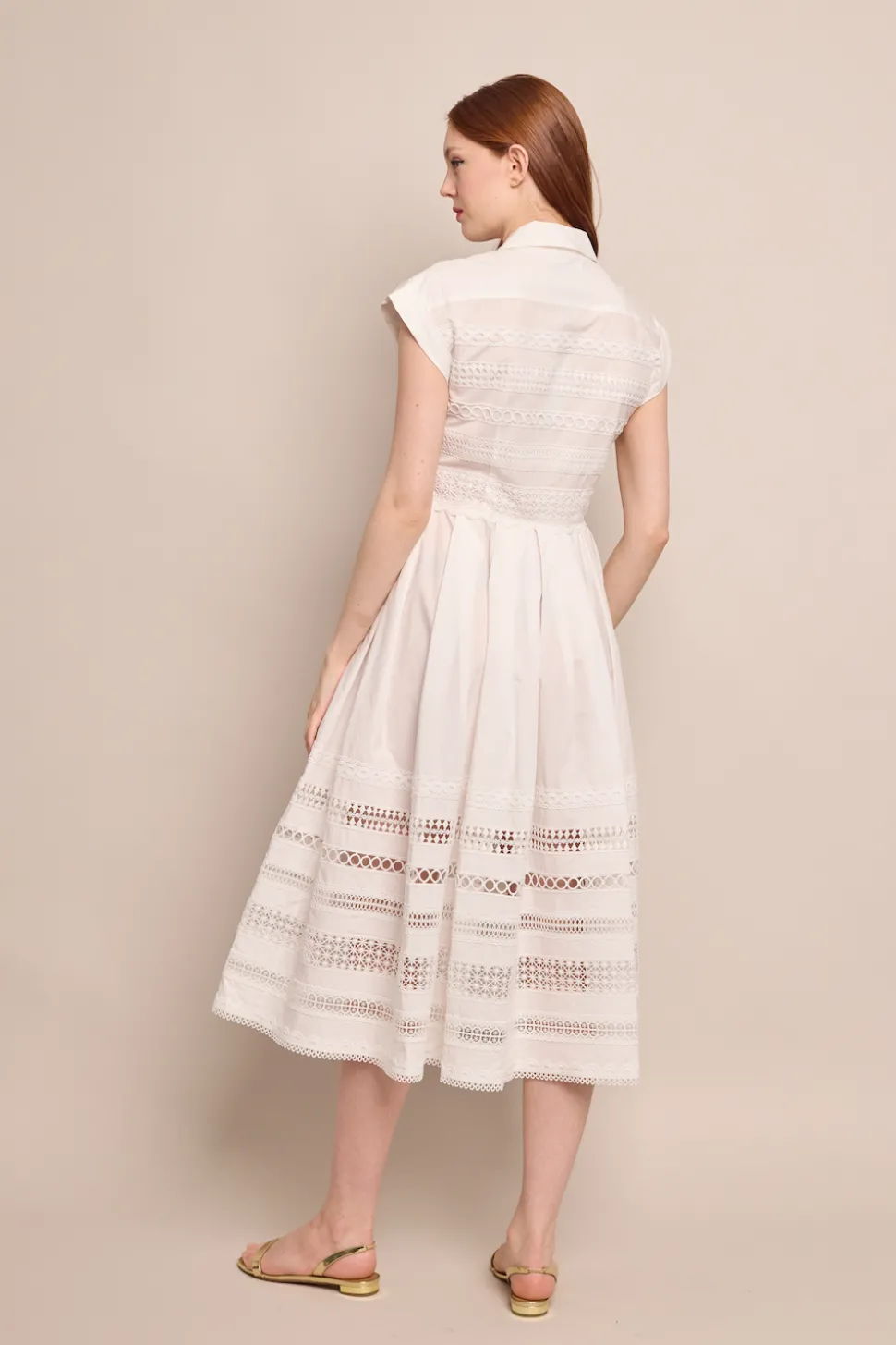 100% cotton poplin. Drop-shoulder, fit-and-flare, midi, belted shirtdress. Cuffed sleeve. Center front button down placket opening. Separate self covered belt with d-ring. Belt has decorative top stitching detail. Side-seam pocket bags. Unlined skirt has variegated box pleats. Darts at front and back bodice for a fitted look. Collared. Front bodice is lined in cotton voile.