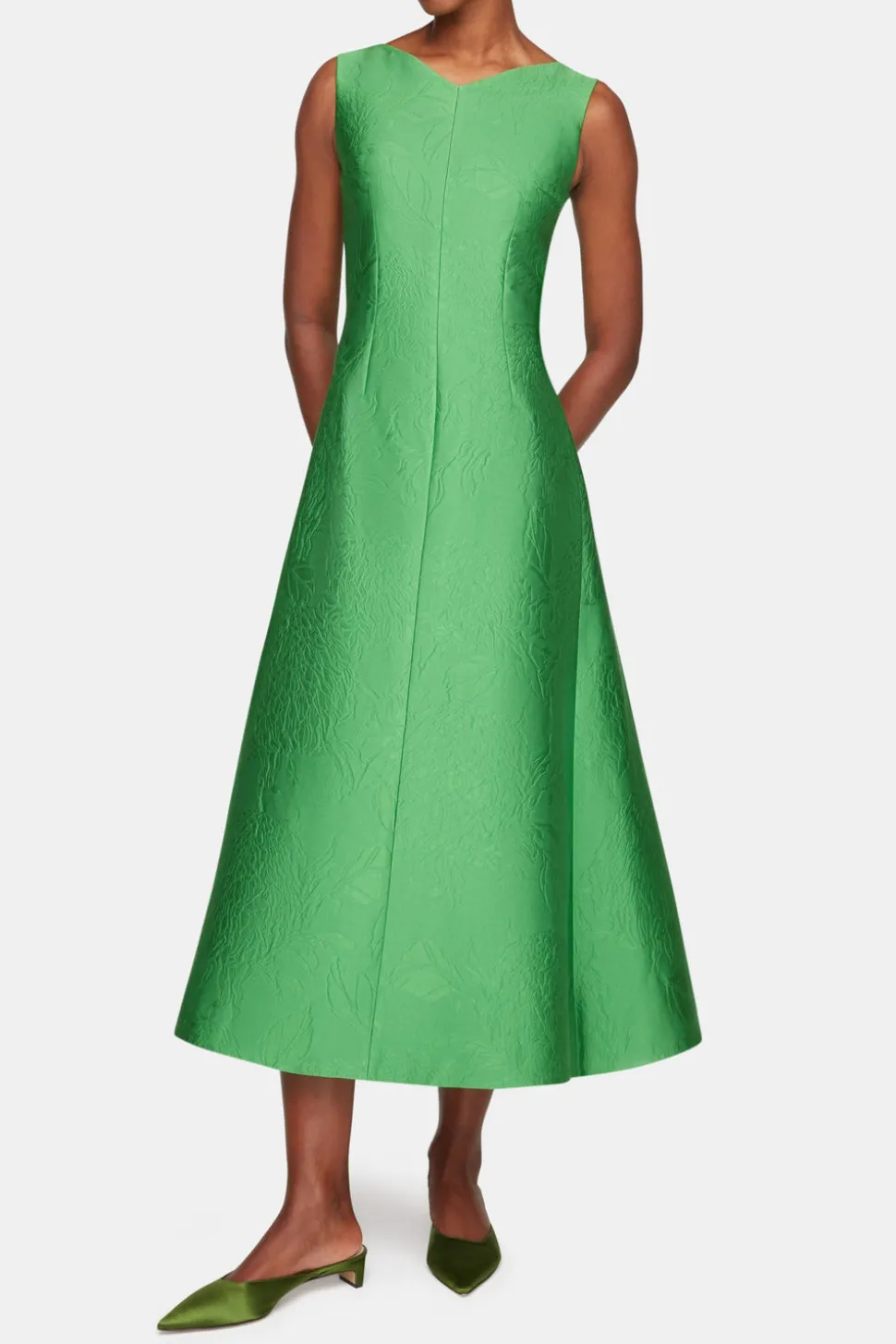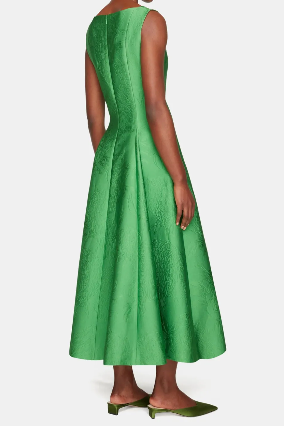 Emilia Wickstead is the epitome of modern femininity. Established in the U.K. in 2008, the ready-to-wear designer is known for impeccable tailoring, bold color, and timeless quality. Refined and sculptural, the Octavie Dress in Green Embossed Cloqué is crafted from a floral-textured fabrication that lends both structure and softness. In a rich emerald hue, its boat neckline and darted bodice enhance the waist before falling into a voluminous, full skirt—an elegant expression of modern grace.