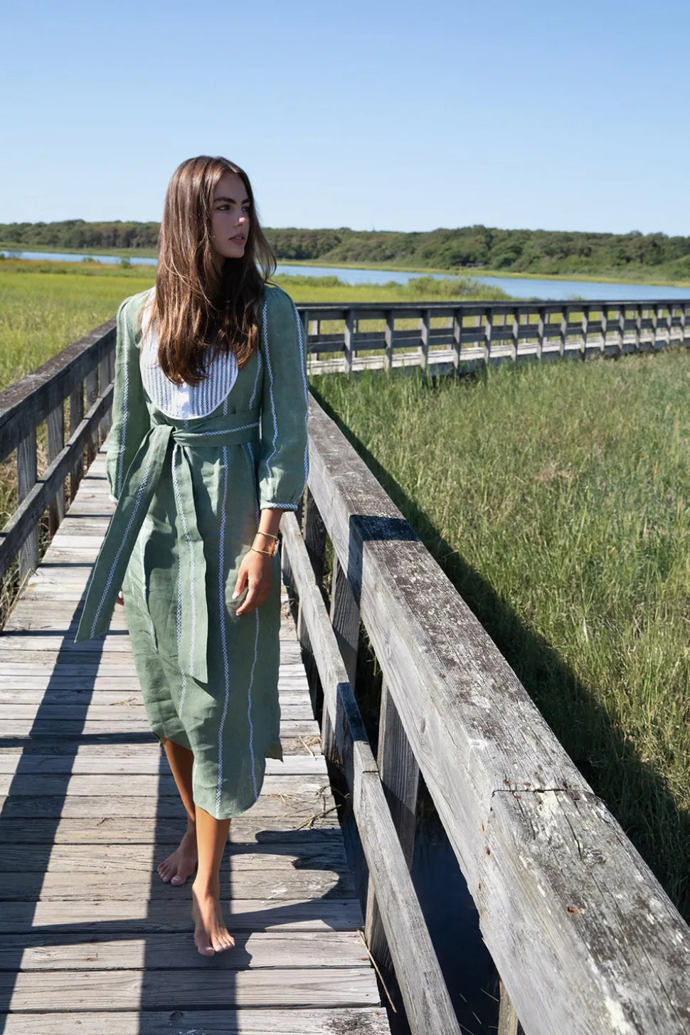 100% linen. Self-tie belt. Bib front. White embroidery.