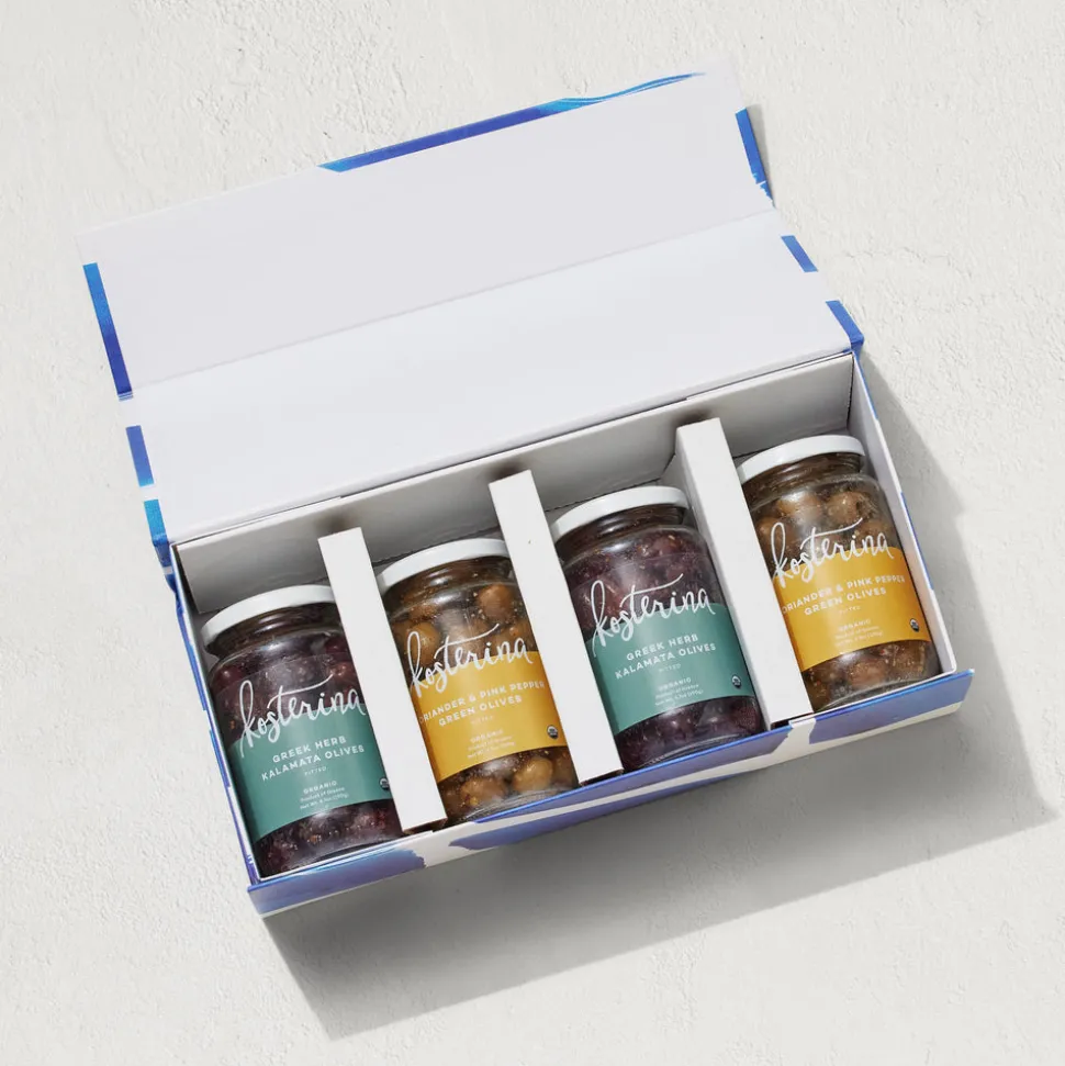 Kosterina believes in the power of the Mediterranean lifestyle, infusing their artisanally made oils, vinegars and skincare products with the fresh, high-quality, old world ingredients that we can trust for our health. Pitted and dry-packed with fresh herbs and spices, the Olives Gift Set is the ideal savory gift. Foodies, hosts, and afternoon snackers alike will adore these premium, gourmet olives, packaged in a chic, Mediterranean blue and white gift box—no additional wrapping needed.