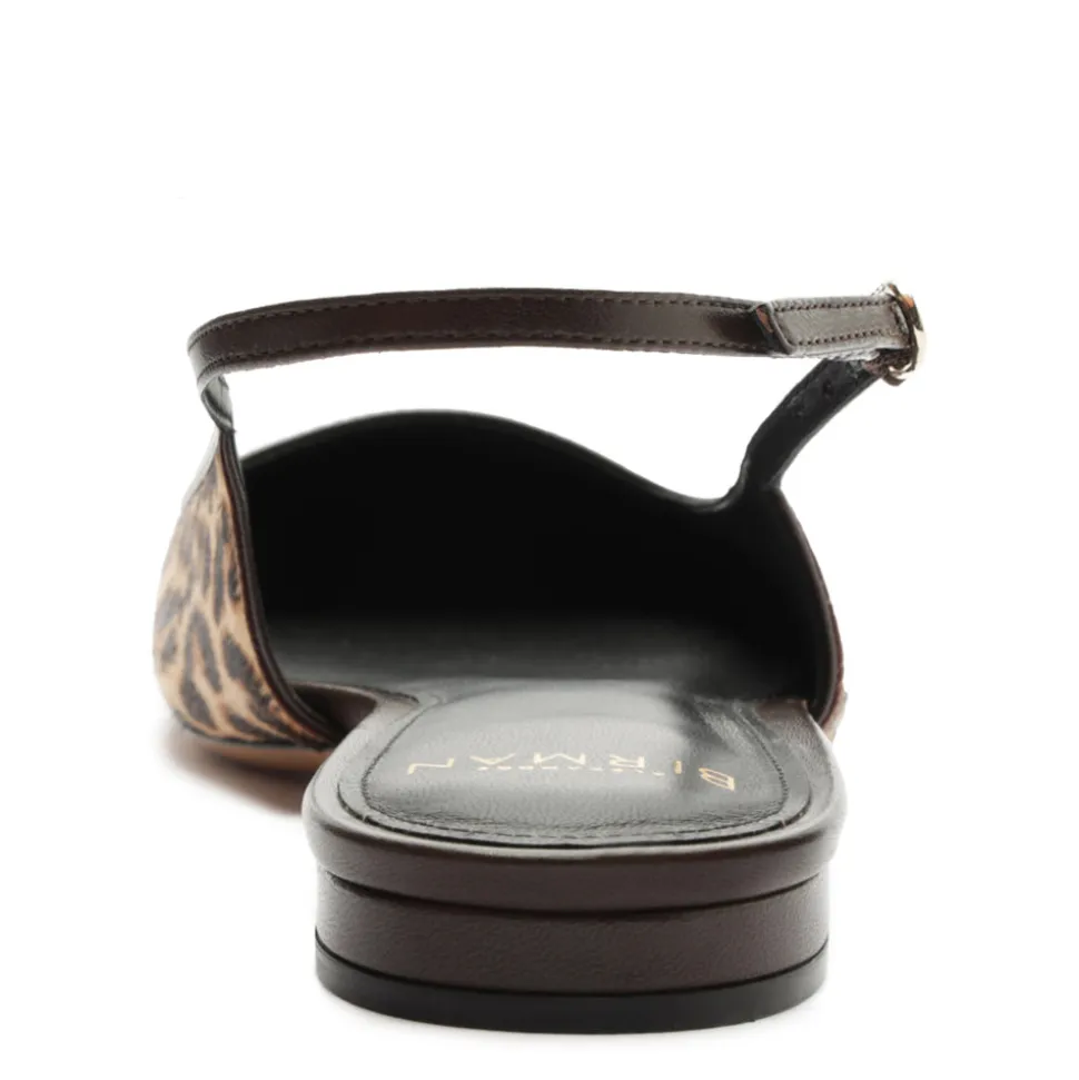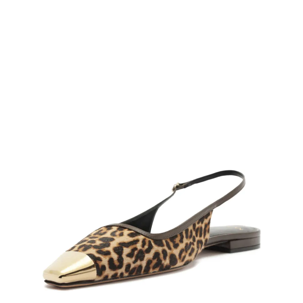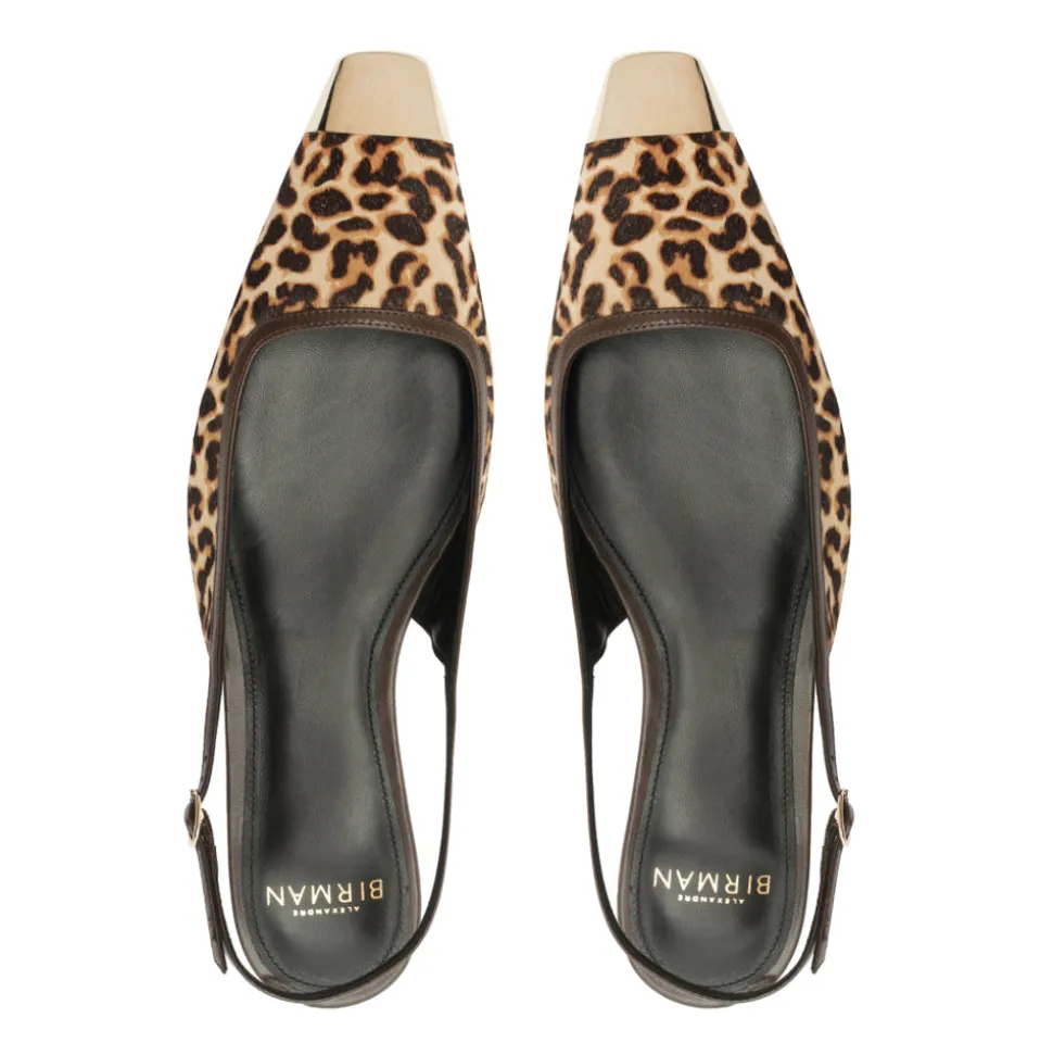 Founded in 2008, Alexandre Birman infuses each of his fine footwear collections with the spirit, sensuality and sophistication of his Brazilian heritage. Beginning with thoughtful drawings, exceptional craftsmanship is the brand’s cornerstone, employing fine artisans, superior materials, and thoughtful design to create timeless, luxurious shoes, style after style. The flat version of its heeled counterpart, the Olivia Flat in Leopard showcases a subtly elongated square toe that exudes elegance, complemented by a metallic captoe in a soft gold hue. The slender strap, fastened delicately with a buckle, ensures a personalized and secure fit.