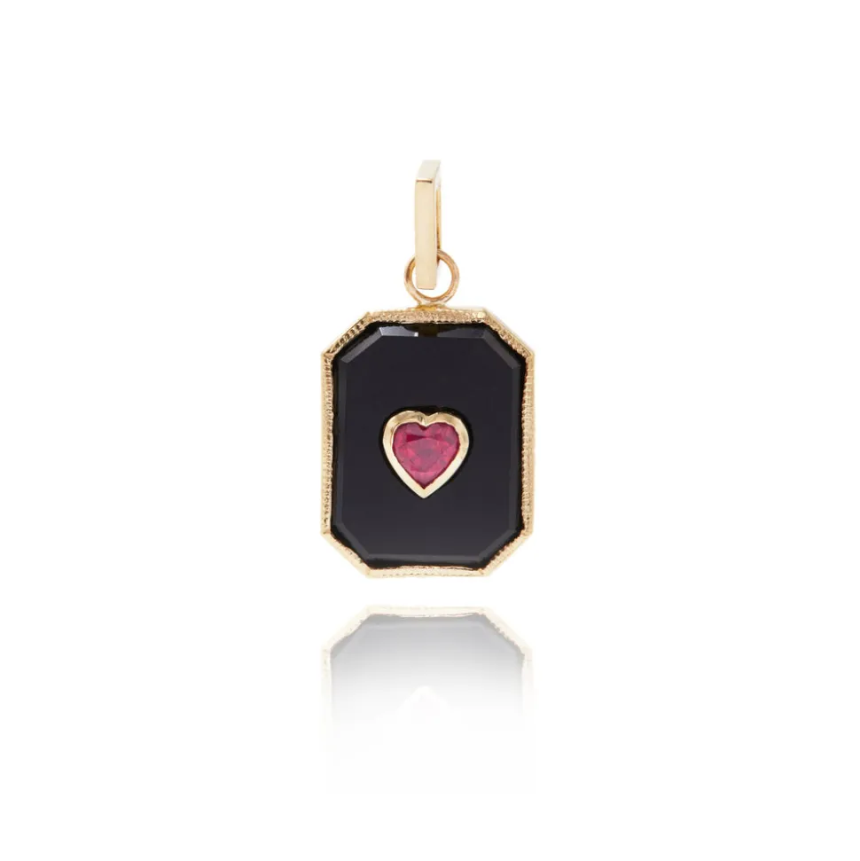 From her studio in New York City, Ashley Zhang designs one-of-a-kind fine jewelry that will last a lifetime. Custom carved from recycled onyx and prominent featuring a bezel set ruby, this charm pendant is a loving addition to your necklace chain. All Ashley Zhang charms are set on a signature rectangle bail, which allows for the charm to slide on most small to medium chains.