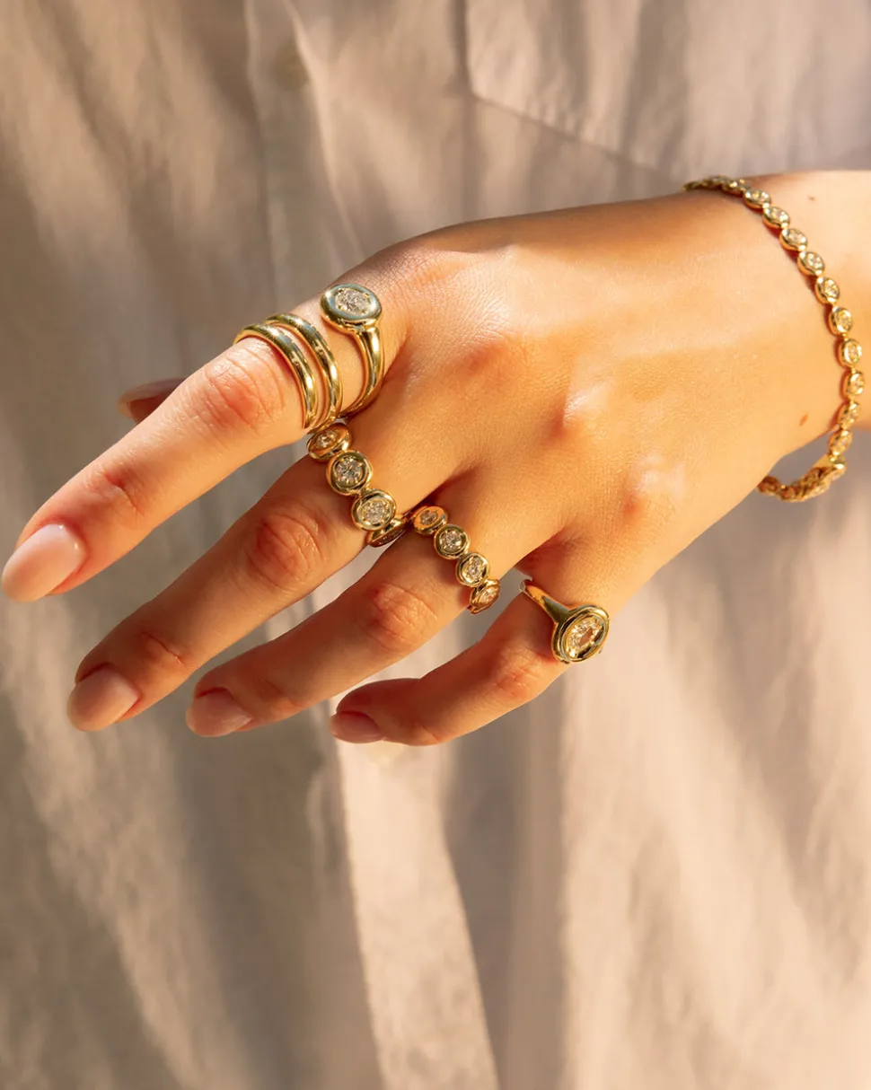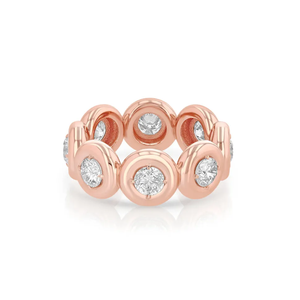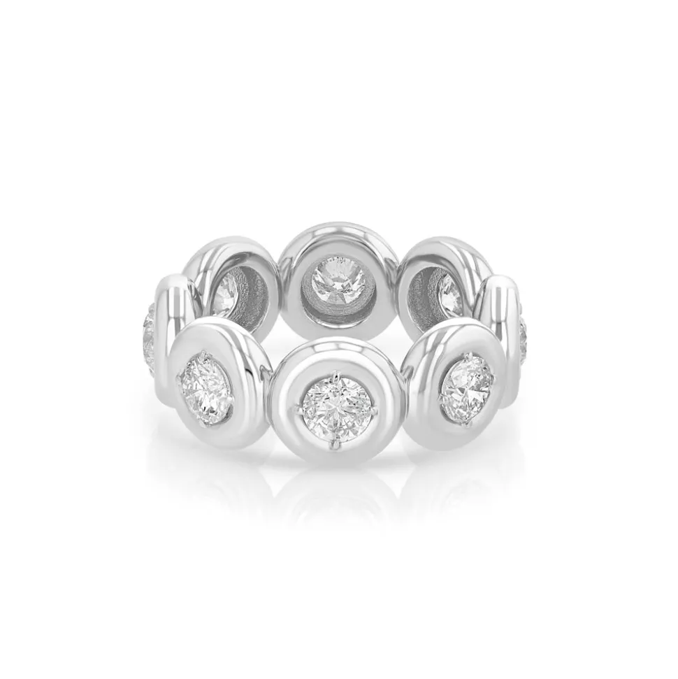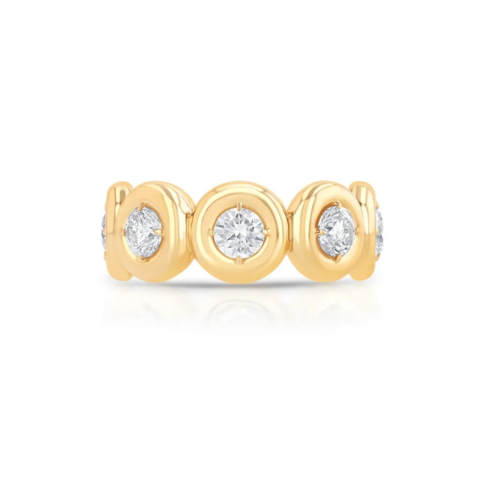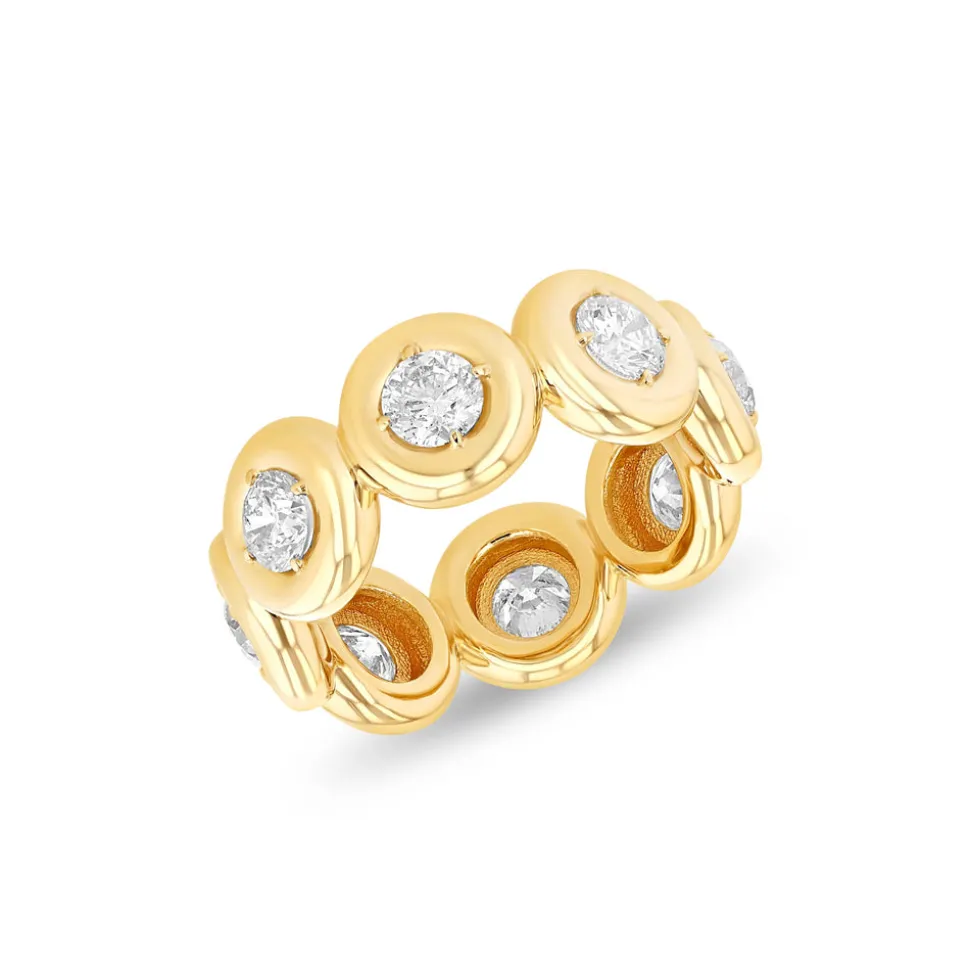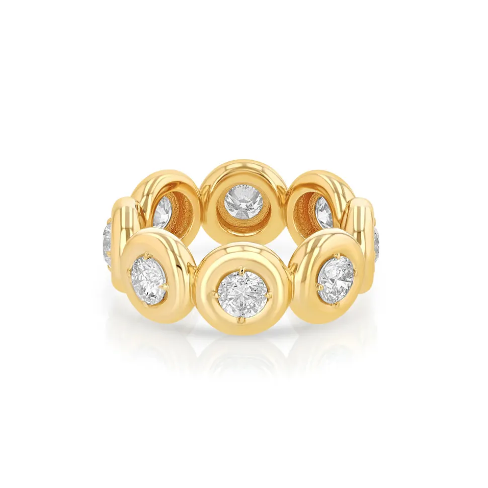 Born into a family of fine jewelers, sisters Oren and Yarden Katz use recycled 14 karat gold and ethically sourced diamonds to craft their contemporary pieces in their Downtown Los Angeles studio. Worn by the likes of Taylor Swift and Jessica Alba, the jewelers are inspired by antique and custom pieces found in their mother’s jewelry box, and each new collection brings a uniquely modern interpretation of heirloom design and technique. Round diamonds, wrapped in the brand’s signature puffy bezel setting, give the Orb Eternity Band its special distinction of understated brilliance.