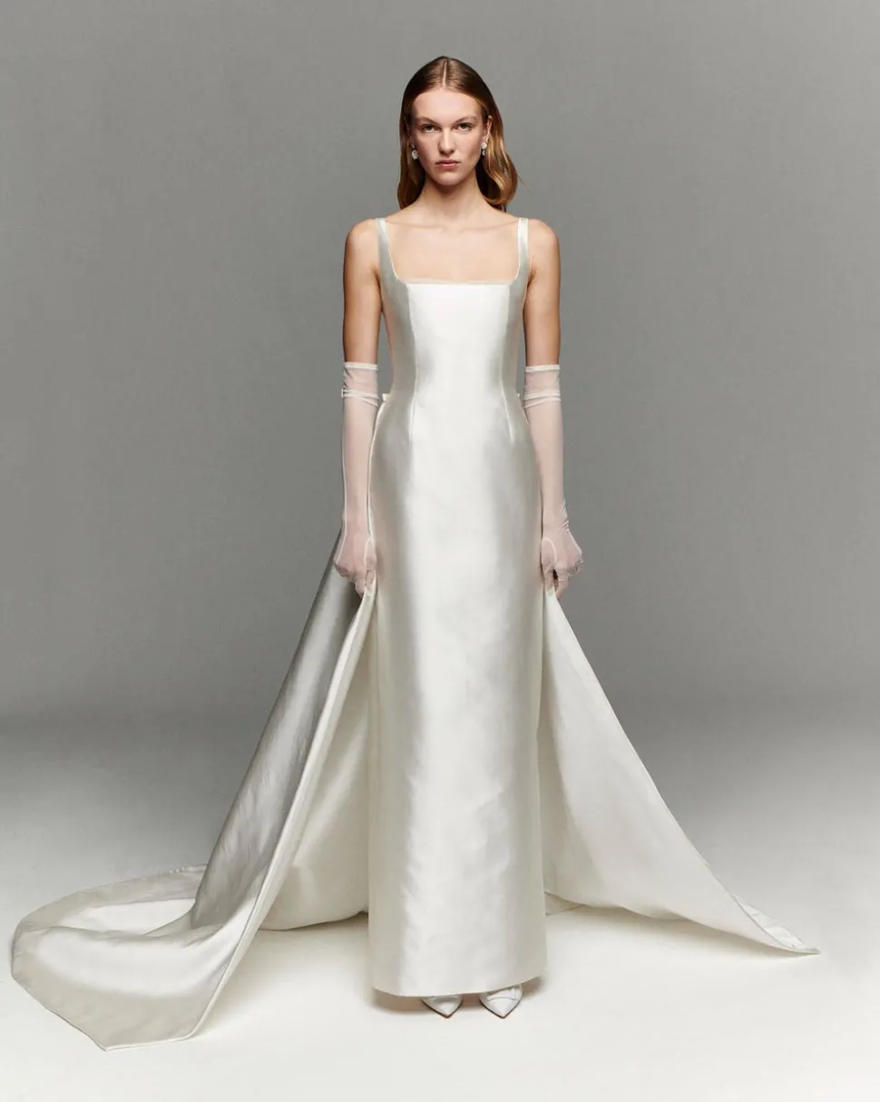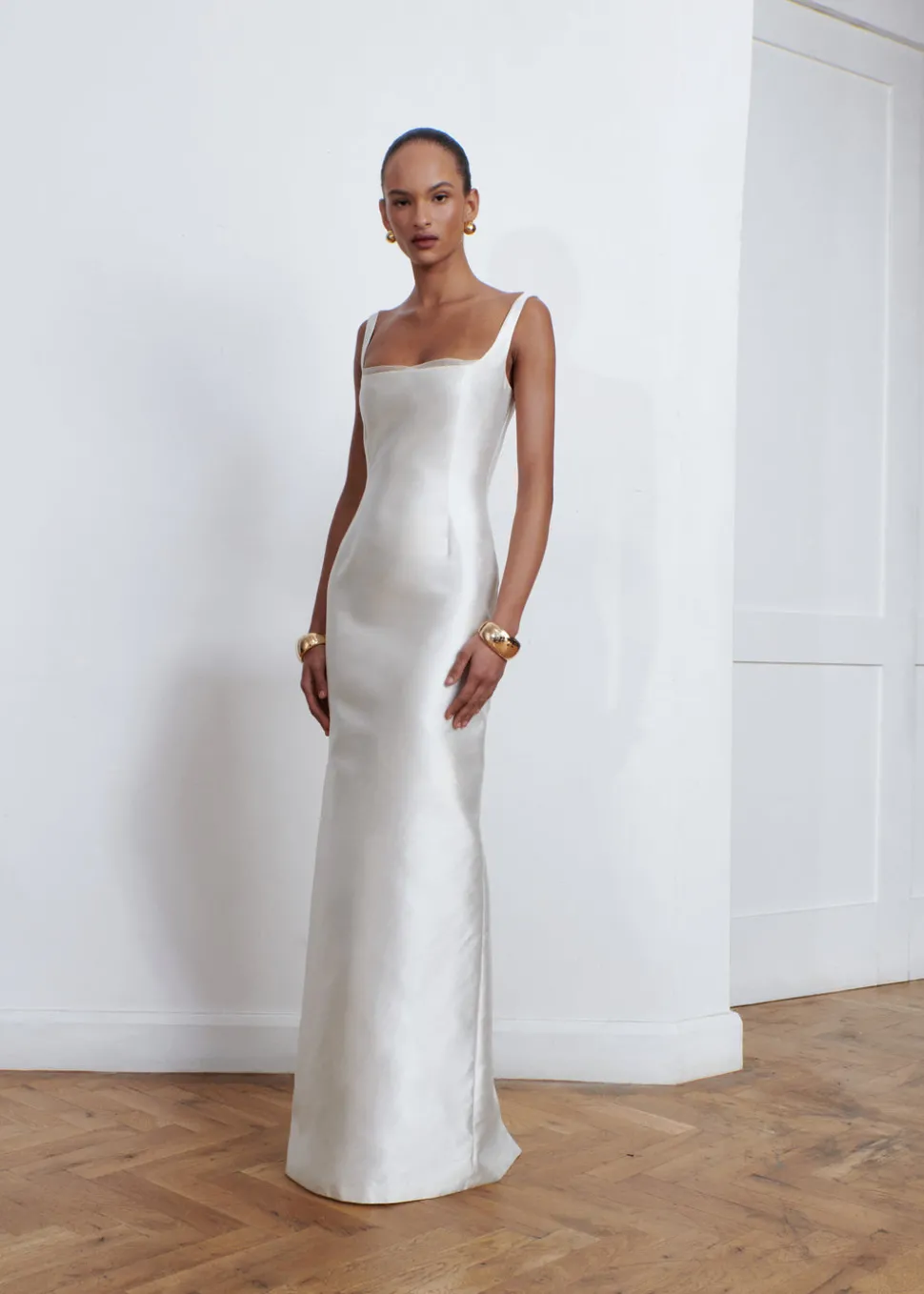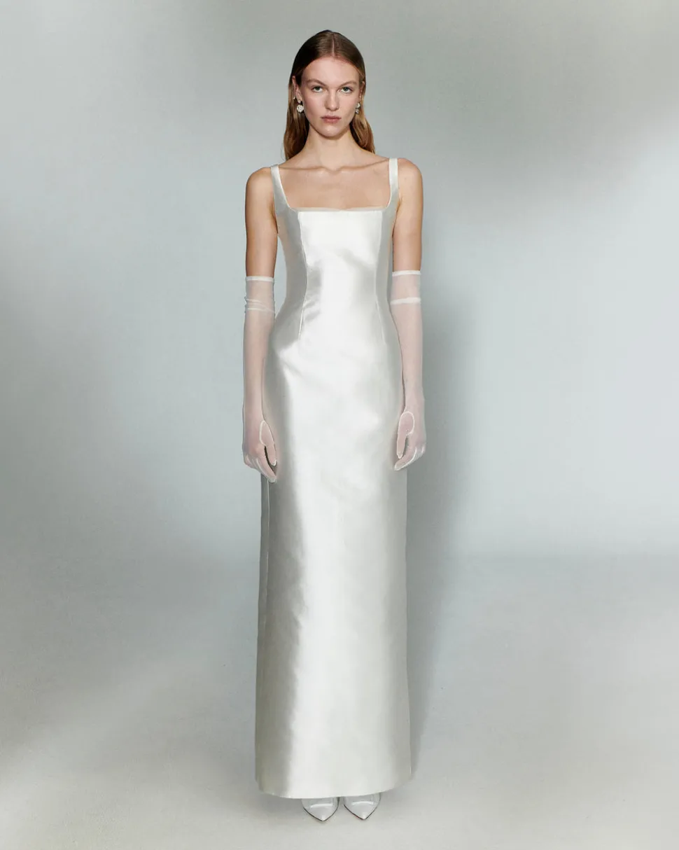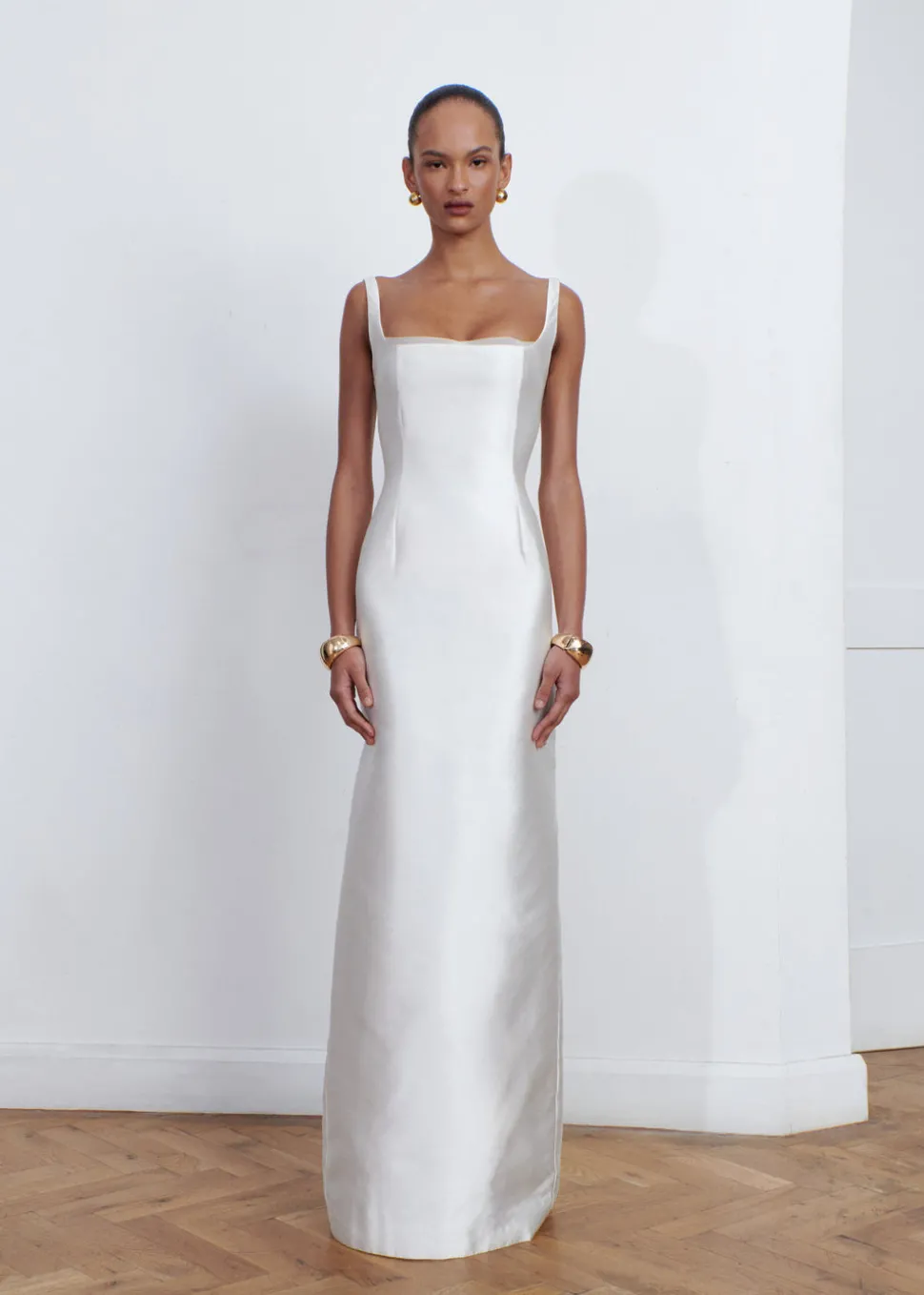 Handmade at its London atelier, The OWN Studio’s signature style combines pared-back, contemporary silhouettes with unexpected vintage details resulting in considered, minimal styles for the modern woman. The label brings a fresh and contemporary approach to wedding and evening wear. An elegant and refined column mikado silhouette that is as chic as it is timeless, this angular square neckline is softened by an accent of silk organza. Fully lined in silk, pair the Organza Peekaboo Silk Mikado Gown | STYLE 111 with tulle gloves and the matching detachable silk train for the most incredible statement.