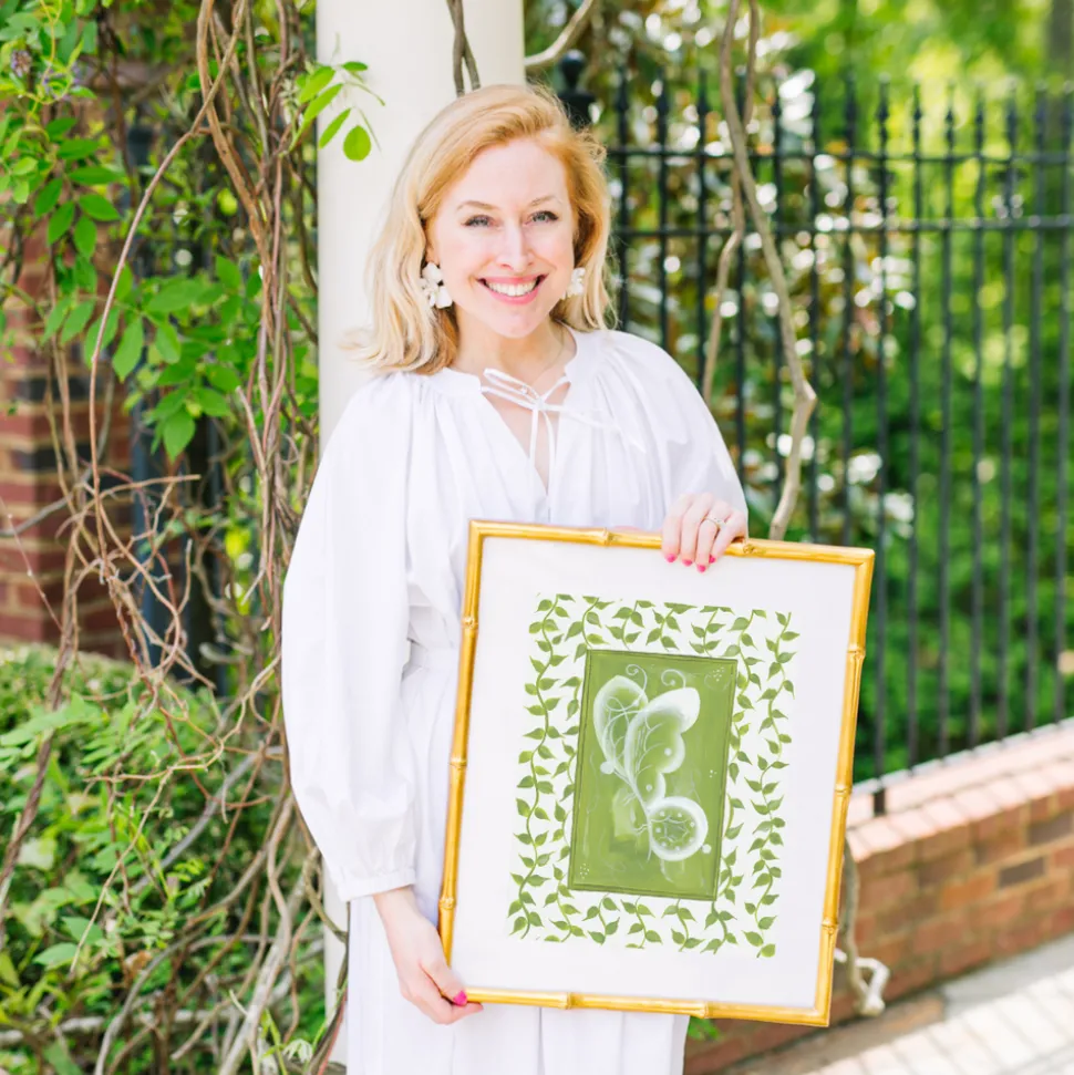 Inspired by the whimsically delicate beauty of chinoiserie, Heather Tamburello began creating her own designs while decorating her newlywed home. Today, she brings that passion to Oh So Lovingly, offering heirloom-quality originals and prints that blend timeless artistry with romantic charm. The Tourbillon Vert, Set of 2, captures the spirit of the English countryside’s grandest greenhouses, pairing chinoiserie-inspired abstract designs in verdant green with whimsical ticking stripes. Each original acrylic painting features a hand-painted tourbillon gouache border on watercolor paper, evoking the richness of garden life and the elegance of every sprout.