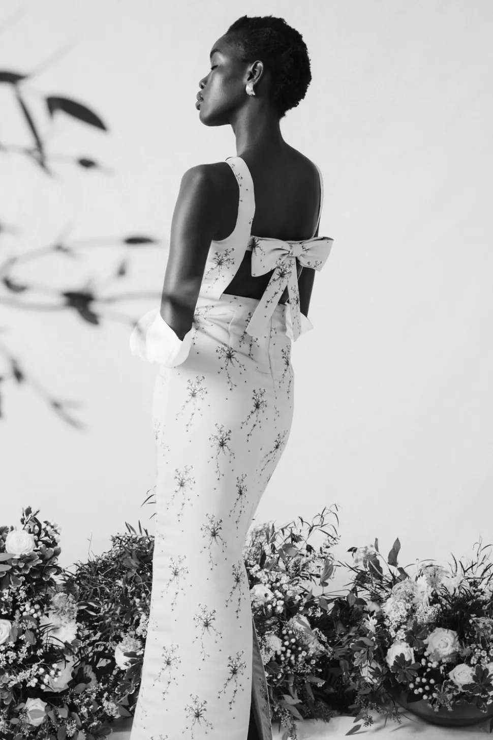 Designed and made in the heart of New York’s Garment District, Lesea Berry draws inspiration from Victorian romanticism, interiors, gardens, and the dynamism of the city itself for the nostalgic beauty of her uniquely luxurious line of womenswear. Each piece is made-to-order, reducing waste, ensuring fit, and asserting an individuality matched only by the women who wear them. The Ayak Dress, from the Spring 24 collection, inspired by the textures of Greece, is the embodiment of feminine simplicity and sophistication. Made in an exquisite Ivory Wildflower Print Silk Faille, this dress features a clean, high square neck, balanced by the alluring open back. An optional removable train is the icing on the (wedding) cake!