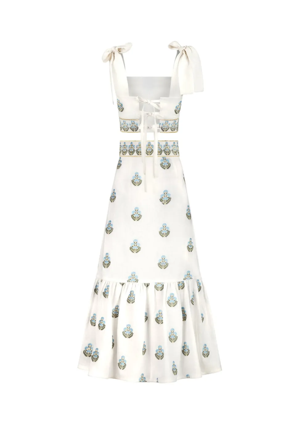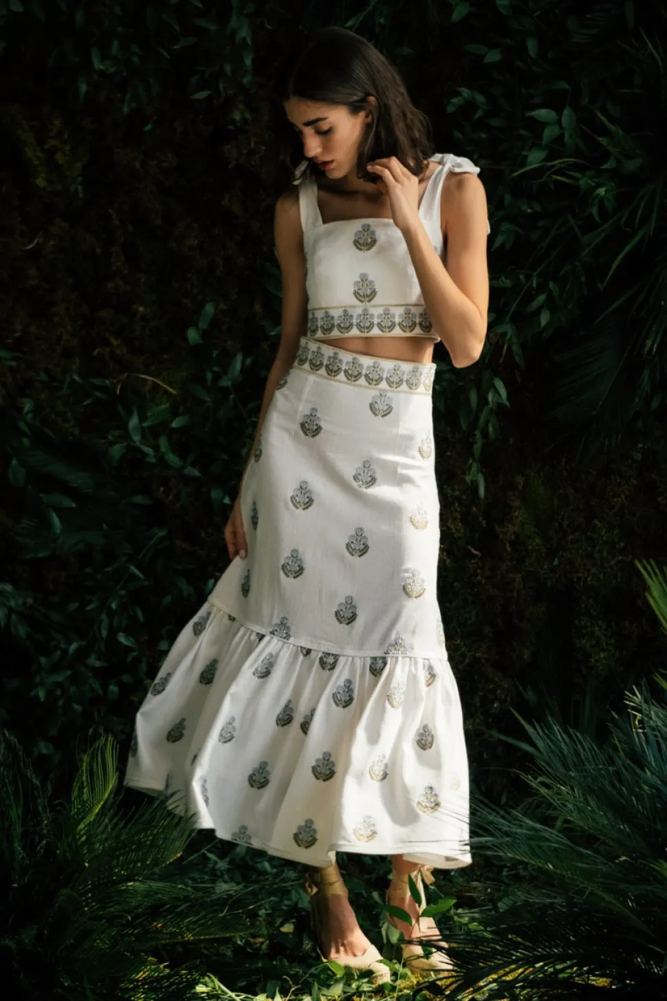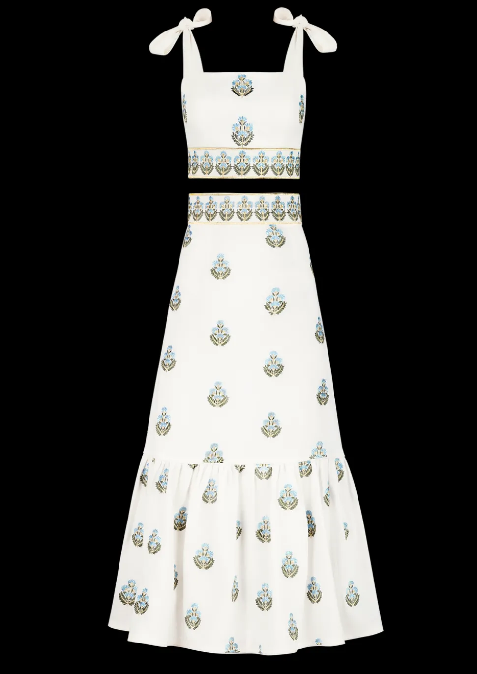 The brainchild of dynamic Iranian mother-daughter duo, Roshanak Varasteh and Leily Amirsardary Ahmed, RosewaterHouse is more than a fashion label; it’is a testament to heritage, artisanal craftsmanship, and timeless design. Drawing inspiration from their cherished family heirlooms, Roshanak and Leily pay homage to the rich cultural tapestry of the Middle East, working exclusively with local artisans who breathe new life into age-old techniques, crafting exquisite, limited-edition garments that transcend age, style, and trends. These pieces are sure to become some of your most treasured, like the Begum set in Off-White & Blue—an Over The Moon Exclusive. This striking ensemble is crafted from rich off-white linen embroidered with silk thread. Thoughtful details abound, like the adjustable bow straps along the back and shoulders, offering the best fit for the top. Embroidery along the bottom of the top and the top of the skirt creates a visually stunning effect, while the ruffle at the bottom of the skirt adds a touch of romance.
