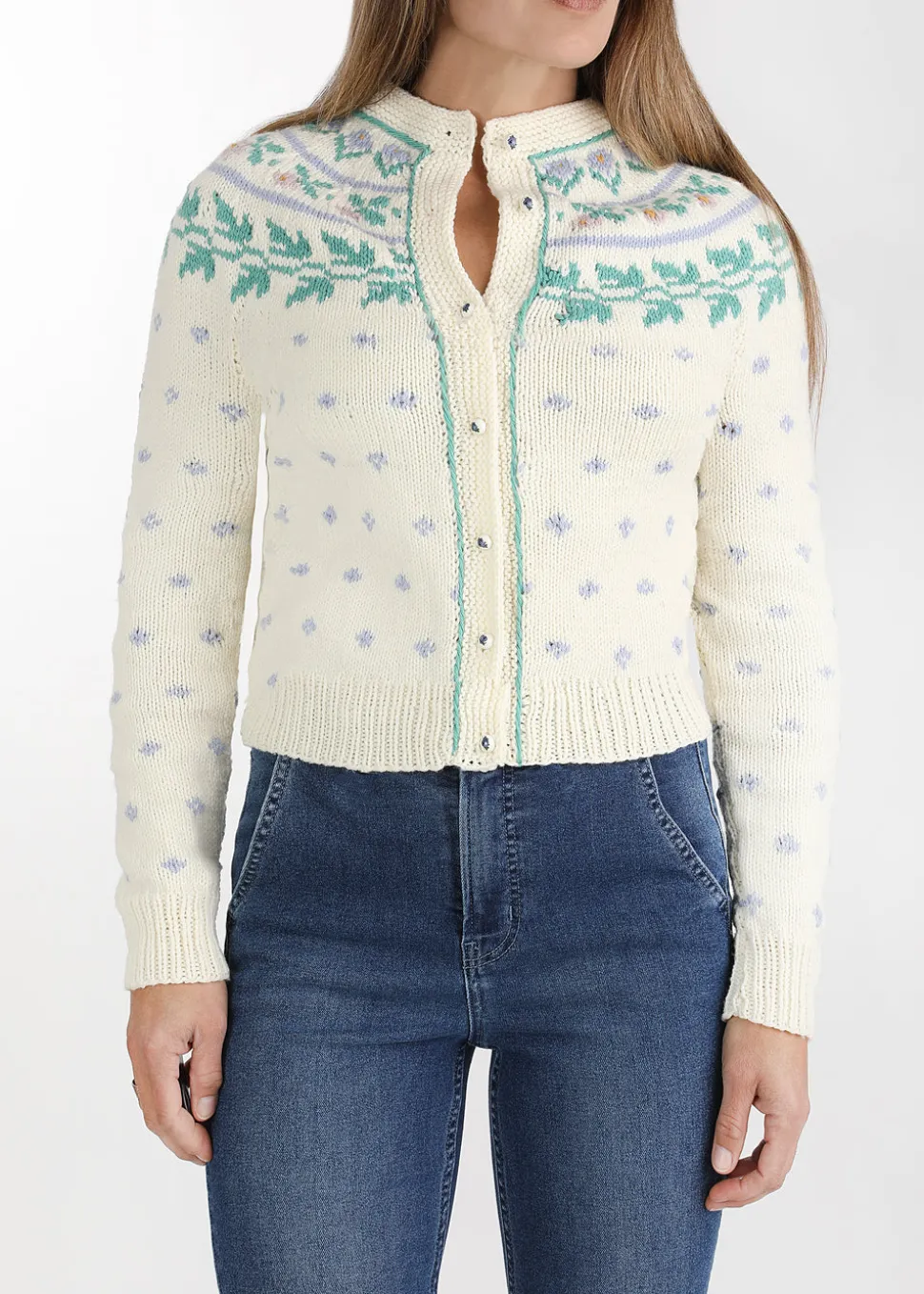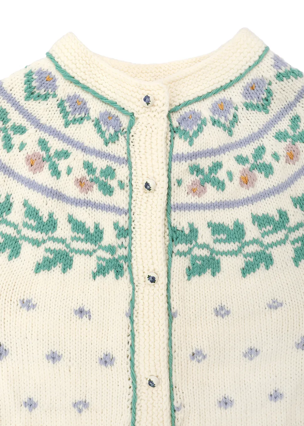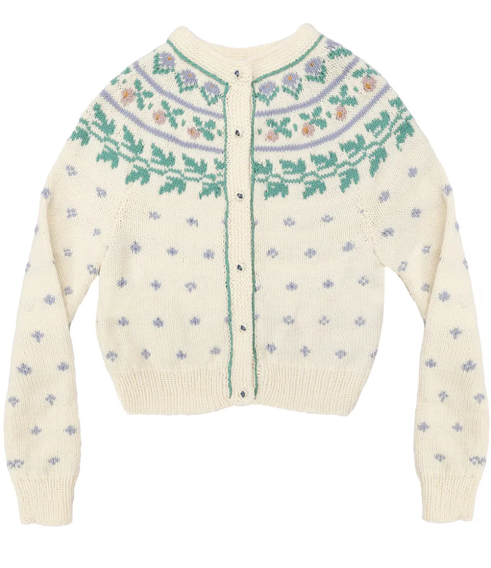 From her studio in France, Michaela Buerger brings a contemporary lens to the rich cultural knitting traditions of her Austrian homeland, designing ultra-feminine, high-quality, everlasting pieces that are handmade in partnership with communities of women across Eastern Europe. Stay warm and comfortable with the irresistibly cozy Floral Fair Isle Cardigan. Crafted with Fair Isle knitting and the softest wool from Arles, this festive sweater features wonderful winter pastel colors, charming flower buttons, and feminine style.