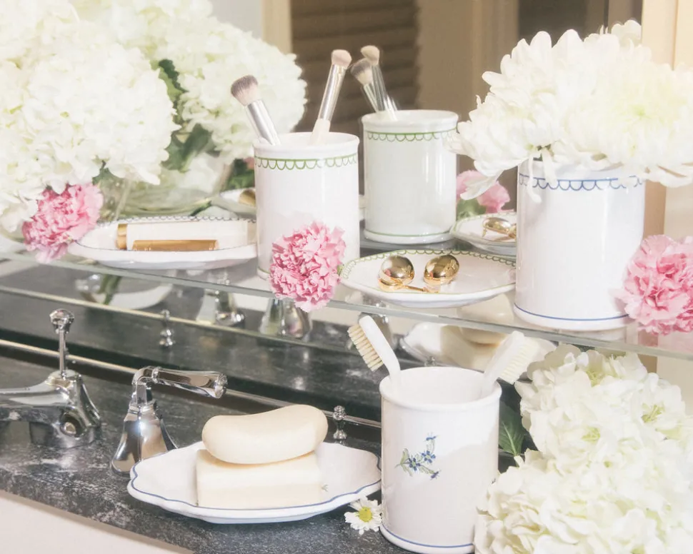 Z.d.G by Zoë de Givenchy’s French-made ceramics, linen, and flatware display refinement above all else. This, and a certain je ne sais quoi, were gleaned from the table of her husband’s uncle, Hubert de Givenchy, the legendary couturier, and one of the century’s finest hosts. The designs breathe new life into master artisan techniques, perfectly showcased in the Les Bleuets capsule collection. This Petite Plate, printed with a green and blue Cornflower—a traditional motif in French porcelain and a favorite of Marie Antoinette—was created to sit in the bathroom as a chic toothbrush or make-up brush holder and matching soap dish. The duo makes a pretty and refined addition to any home and an excellent gift.