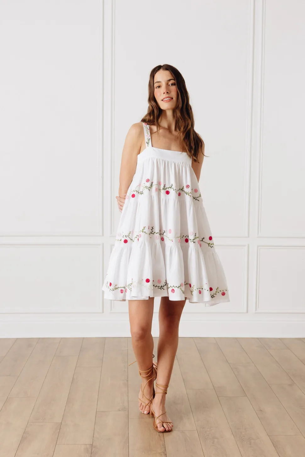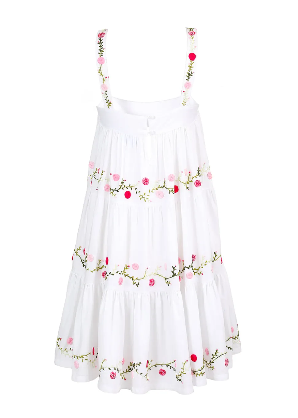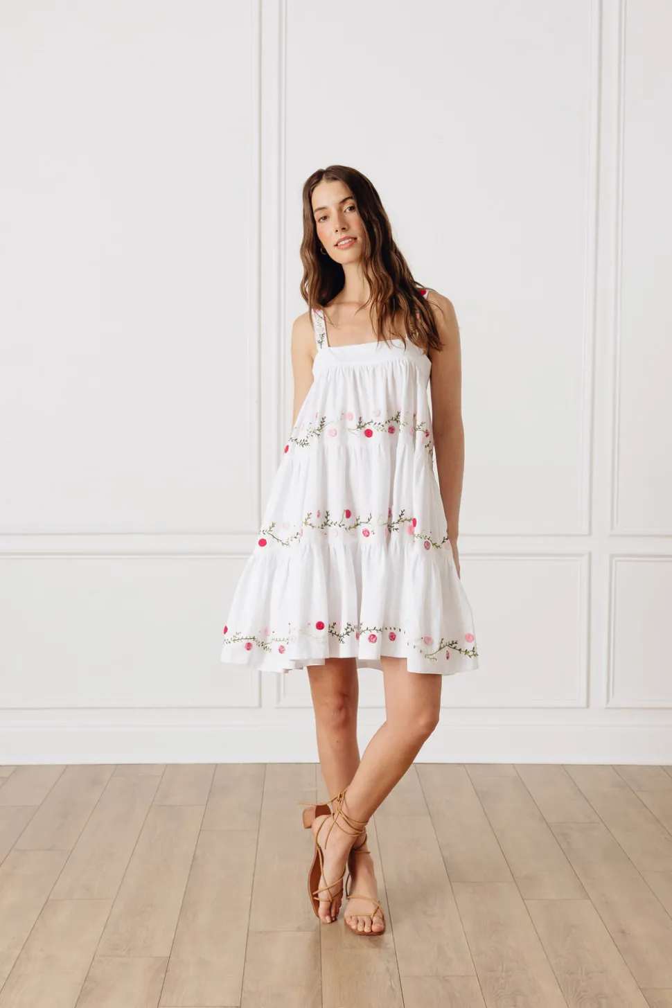 Inspired by her mother’s Mexican heritage and love of Mexican art, Mi Golandrina founder Christina Lynch wanted to continue telling the rich cultural story of her country by empowering local artisans to create garments using techniques indigenous to their community—whether that’s weaving on a backstrap loom, hand-pulling thread to create cut-out lace, or embroidering flowers from memory. Each piece in the collection is a true representation of the the identity and culture of the people who made them. The OTM Exclusive Lila Short Dress exudes effortless elegance with its square neck and shoulder straps and tiered body, chicly adorned with pink and green floral embroidery, all done by hand in Aguacatenango.