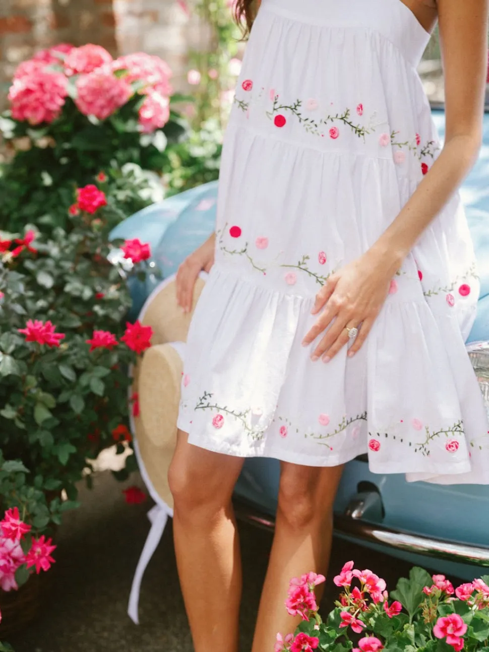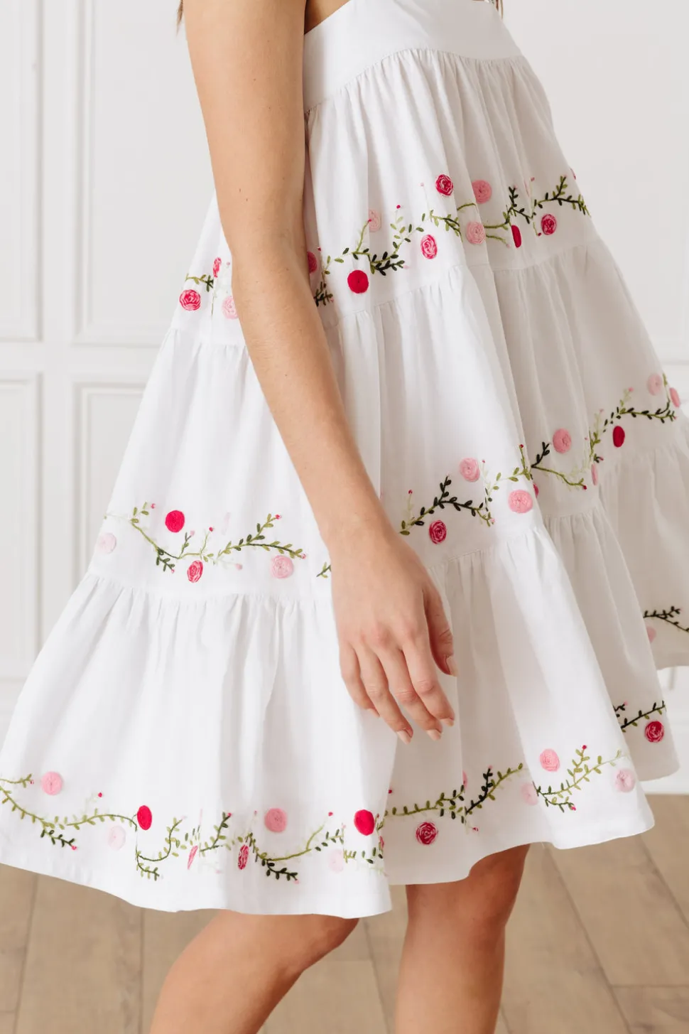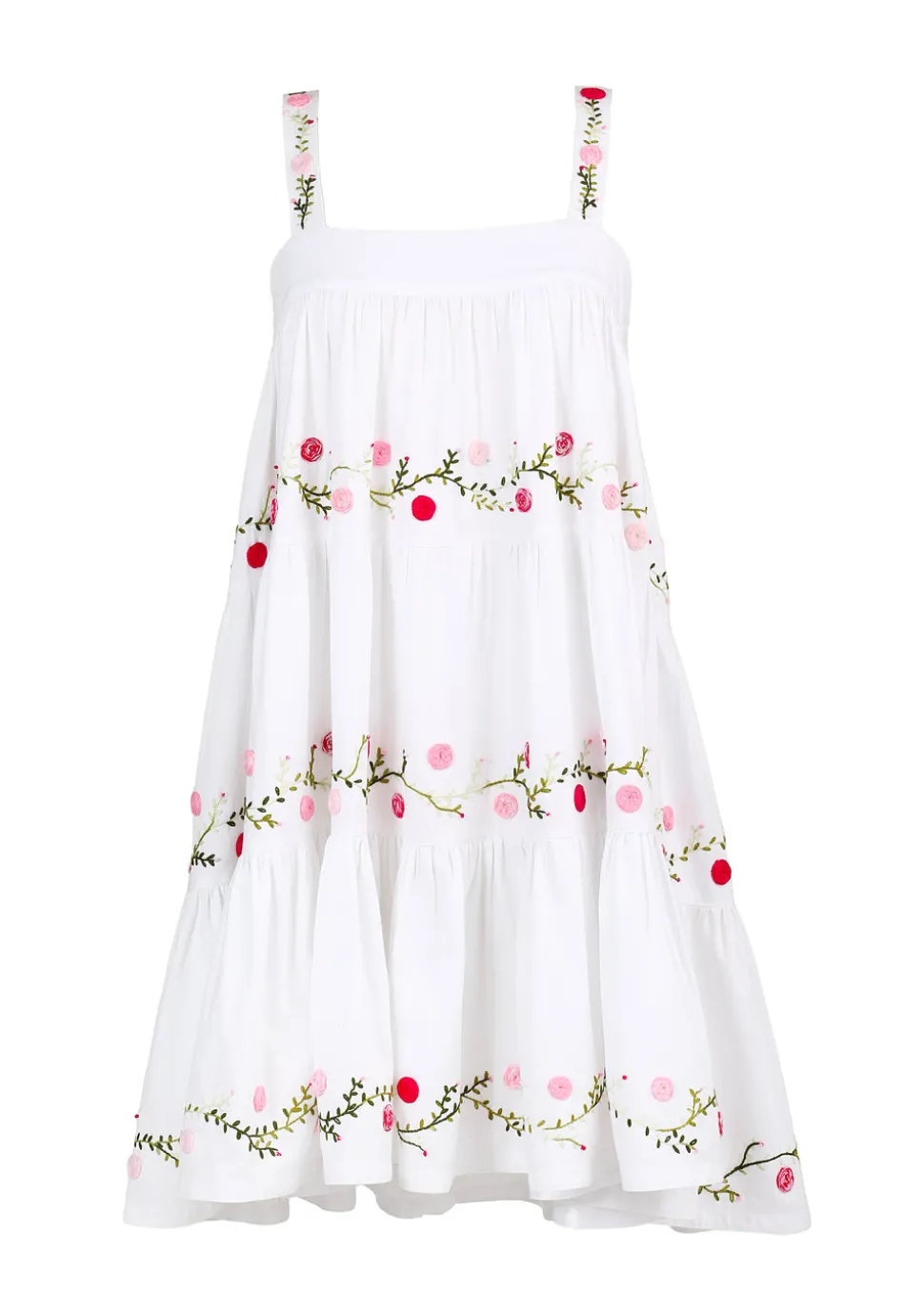 Inspired by her mother’s Mexican heritage and love of Mexican art, Mi Golandrina founder Christina Lynch wanted to continue telling the rich cultural story of her country by empowering local artisans to create garments using techniques indigenous to their community—whether that’s weaving on a backstrap loom, hand-pulling thread to create cut-out lace, or embroidering flowers from memory. Each piece in the collection is a true representation of the the identity and culture of the people who made them. The OTM Exclusive Lila Short Dress exudes effortless elegance with its square neck and shoulder straps and tiered body, chicly adorned with pink and green floral embroidery, all done by hand in Aguacatenango.
