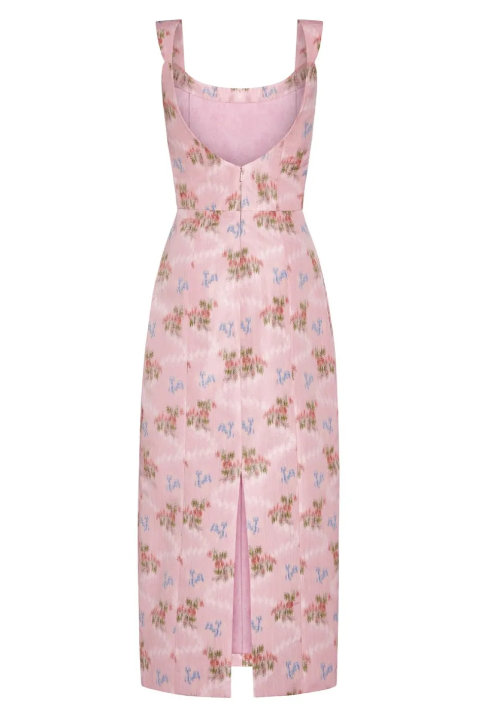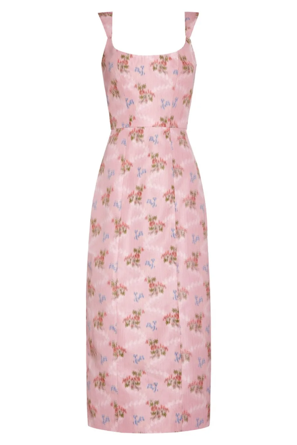 Named after a particularly radiant group of galaxies, Markarian combines designer Alexandra O’Neill’s love of the cosmos and celestial romanticism with timeless design and modern silhouettes. A forward-thinking approach to fashion and a focus on fine craftsmanship result in dresses that are beautiful, well-made, and flattering. With its fitted bodice and feminine print, the Numa Pink Floral Ikat Corset Dress With Back Slit is an Over The Moon exclusive that is simultaneously an example of signature Markarian elegance.
