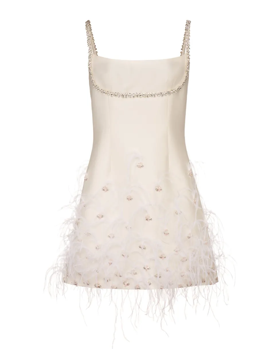 A graduate of the Savannah College of Design, award-winning Alexandra Pijut created her namesake line to offer luxe ready-to-wear pieces that distinguish themselves between femininity and practicality. Exclusive to Over The Moon, the Stella Dress is adorned with delicate clusters of translucent beads and real feathers for an ethereal look. The Stella Dress offers the slightest touch of pink within the handcrafted embellishments. This festive mini is designed for a slim cut, with crystal detailing that wraps around the neckline, making it a charming addition to any bridal trousseau.