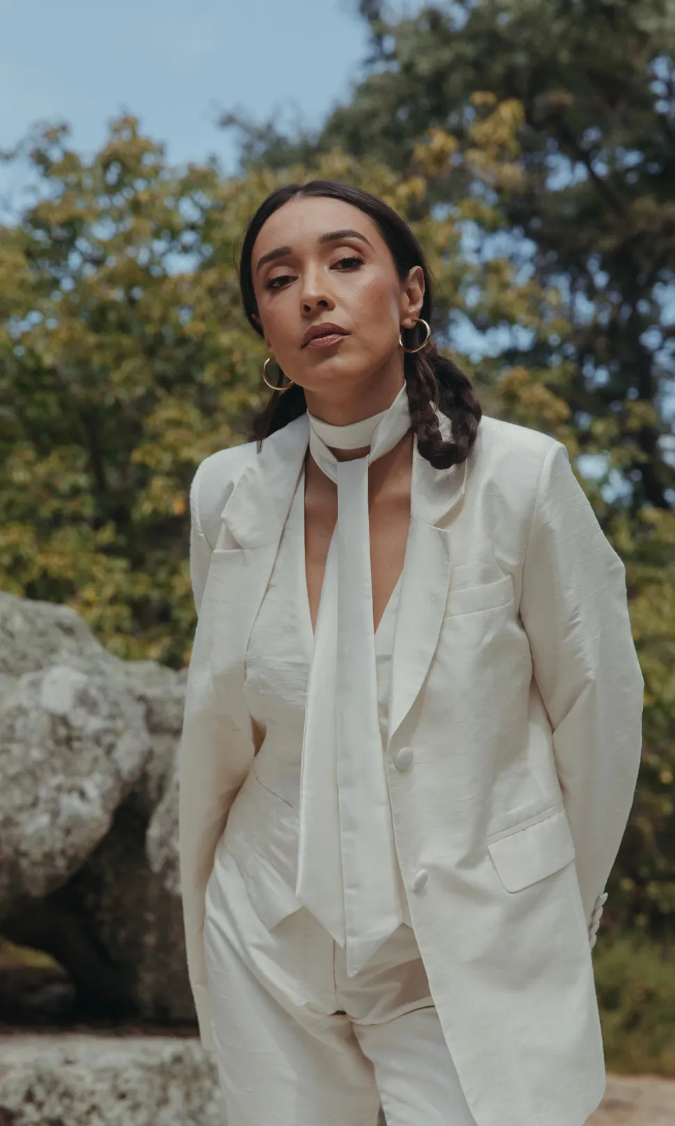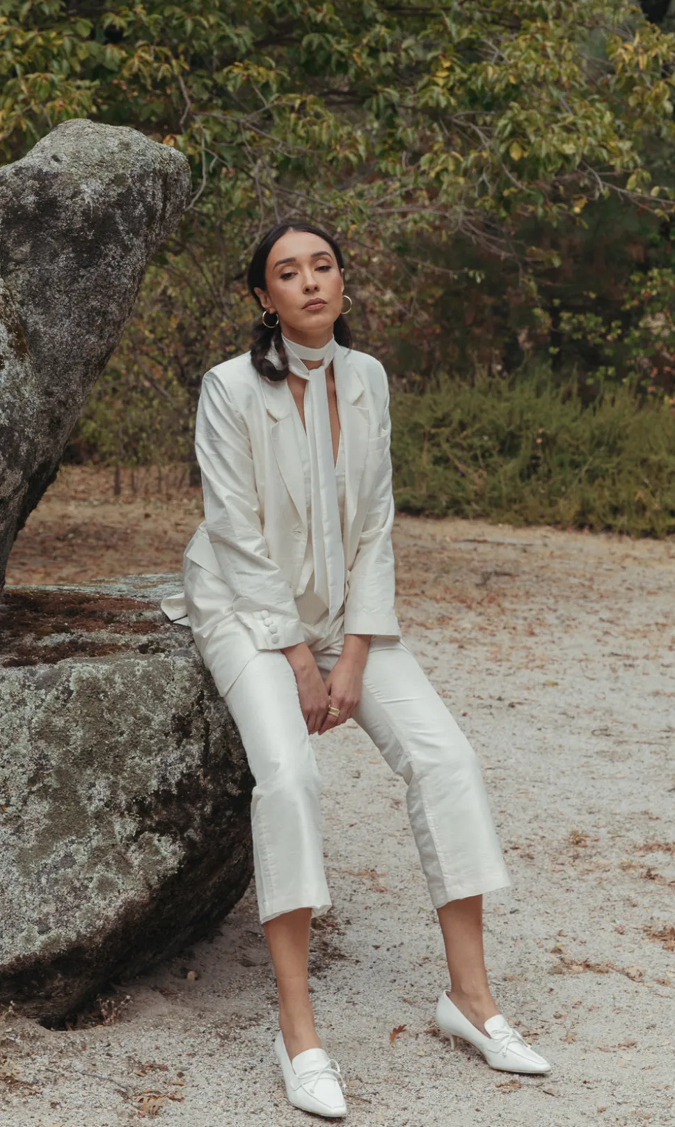 Nestled in California’s San Joaquin Valley, Daughters of Simone draws inspiration from American themes and culture, specializing in bridal wear and suits. The silhouettes evoke a blend of Victorian and Western influences, infused with the free-spirited essence of the 1970s. The Otto Silk Taffeta Bridal Suit boasts silk taffeta, ivory satin liner, and a pant that can be cropped or full length.