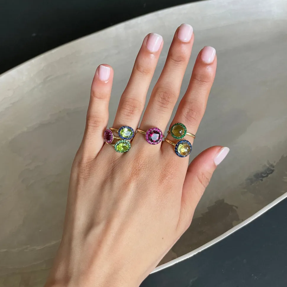 A partnership between Rosa de la Cruz and Tierney Horne, this jewelry line ties together the worlds of fashion and art with collections set to appeal across generations, and with other pieces. Inspired by vintage jewelry, as well as contemporary and modern art, these minimalist pieces spark creativity and joy, and celebrate singular style. The Oval Gem Ring marries tradition and style with a single, prominent gem, outlined by smaller ones. Fit for a queen.