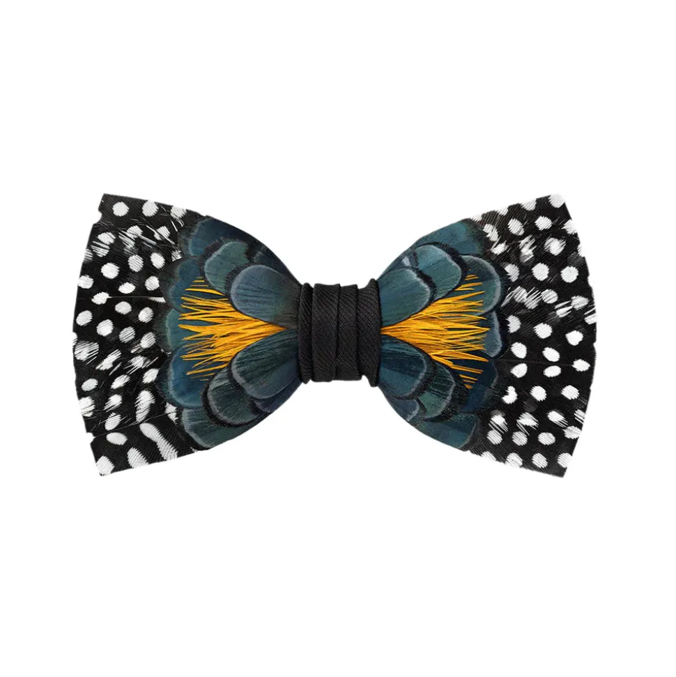 Brackish began with one feather bow tie designed by Ben Ross and gifted to his groomsman, Jeff Plotner. Since its inception, the brand has blossomed into full line of men’s and women’s accessories designed and handcrafted in Charleston, South Carolina with each piece focused on honoring the beauty found in nature. Bold, unique, and full of personality, the Owen’s Town Bow Tie features a striking combination of guinea, yellow pheasant, and navy lady feathers. The soft yellow pheasant blossoms out from a bed of small navy lady feathers, creating a rich contrast, while the big dot guinea ties in with the black borders of the navy lady feathers, giving this bow tie a bold, commanding silhouette.
