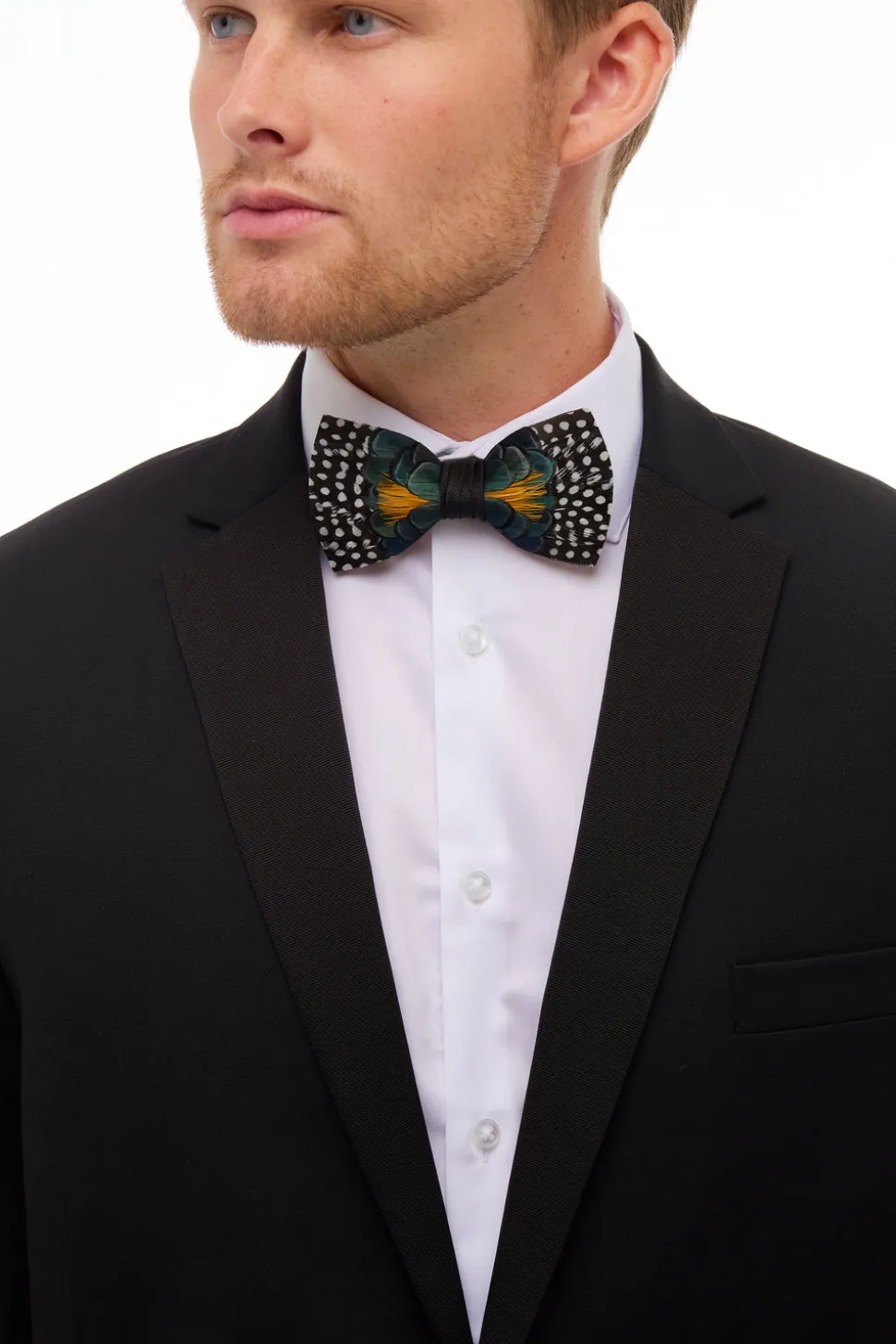 Ideal for making a statement with its intricate feather details and vibrant colors, the Owen’s Town Bow Tie adds an unexpected touch of natural elegance to any formal look.