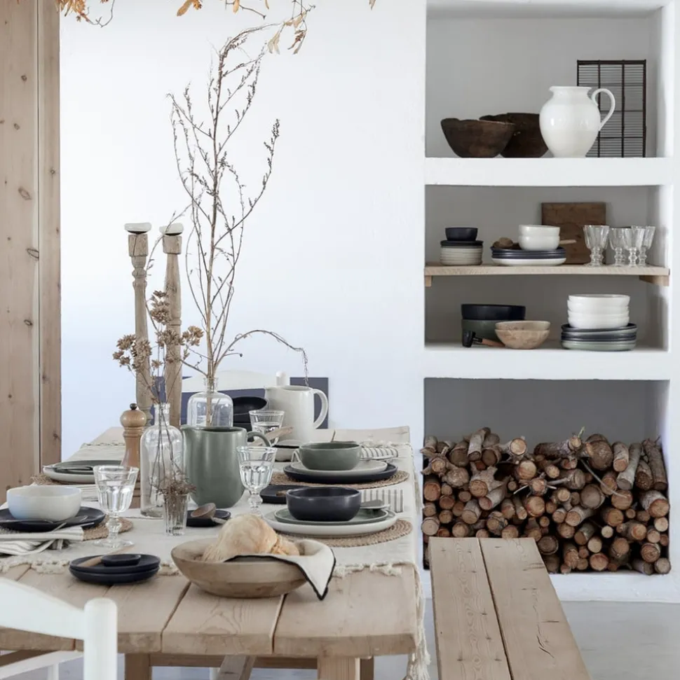 Fine stoneware. Matte glaze. Stackable. Stain resistant. Chip resistant.