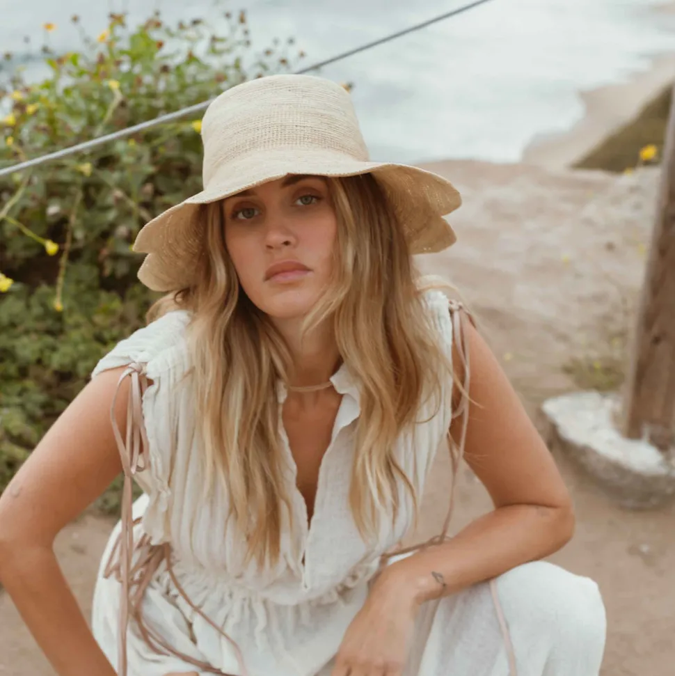 Founded, owned, and operated by women, Freya redefines the Panama hat with modernized silhouettes, UPF 50+ coverage, and organic materials. Embracing 3000 years of tradition, each piece is handcrafted with toquilla palm plant fibers by artisans in Northern Ecuador, and designed with a contemporary eye, resulting in stylish, versatile pieces made to last a lifetime. A soft, pliable crochet hat, featuring a contrasting scalloped trim, the Packable Scallop Crochet Bucket in Natural boasts a narrow silhouette and an always cool shape.