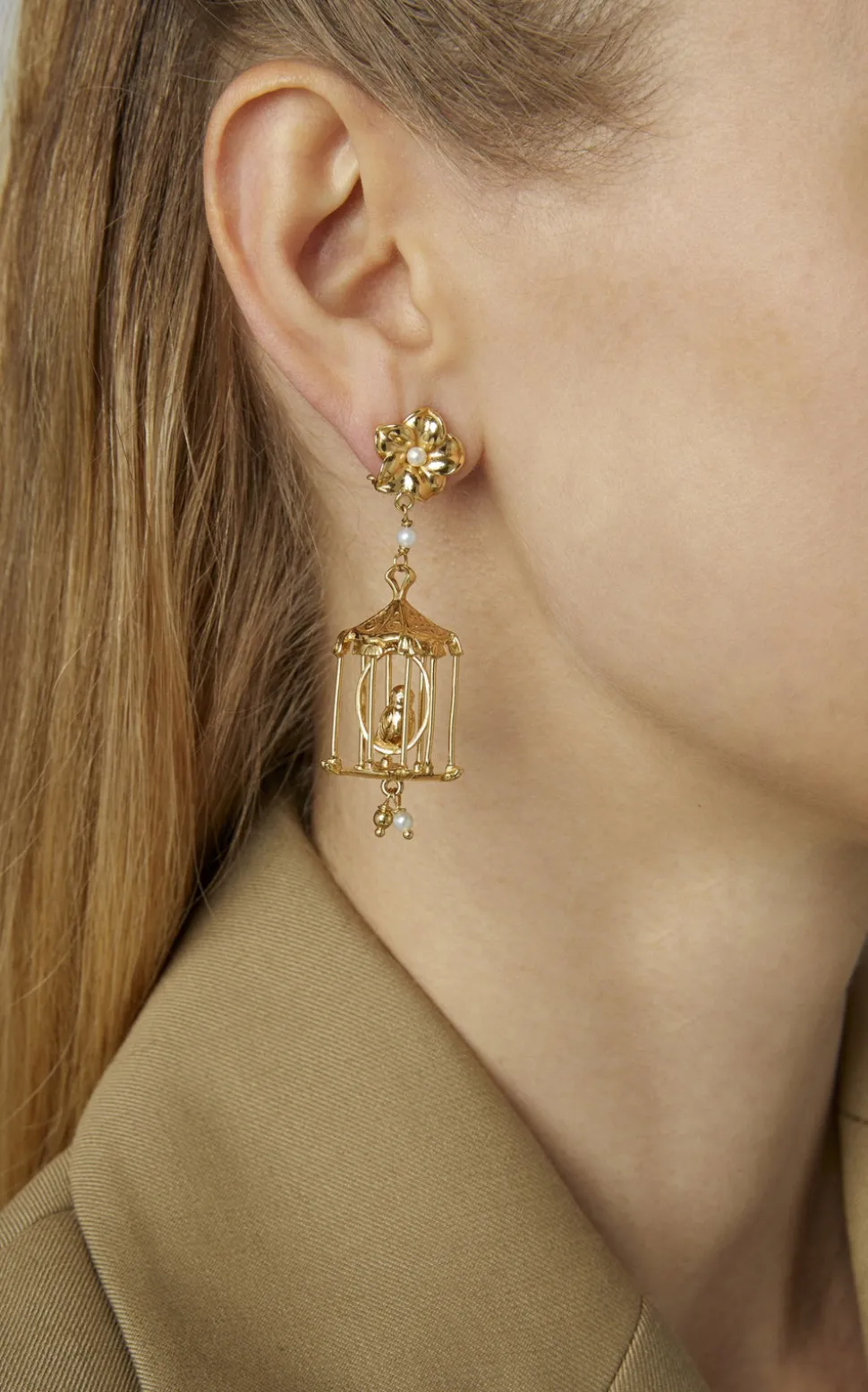 Of Rare Origin approaches jewelry as wearable poetry—at once elegant and intriguing. Fusing creative curiosity, resourcefulness, and international heritage, mother and daughter, Leslie and Octavia launched this New York City-based brand in March 2016, combining thirty years of experience in the jewelry, design, and arts industries. The handmade Pagoda Earrings in Gold feature a birdcage adorned with delicate pearls.