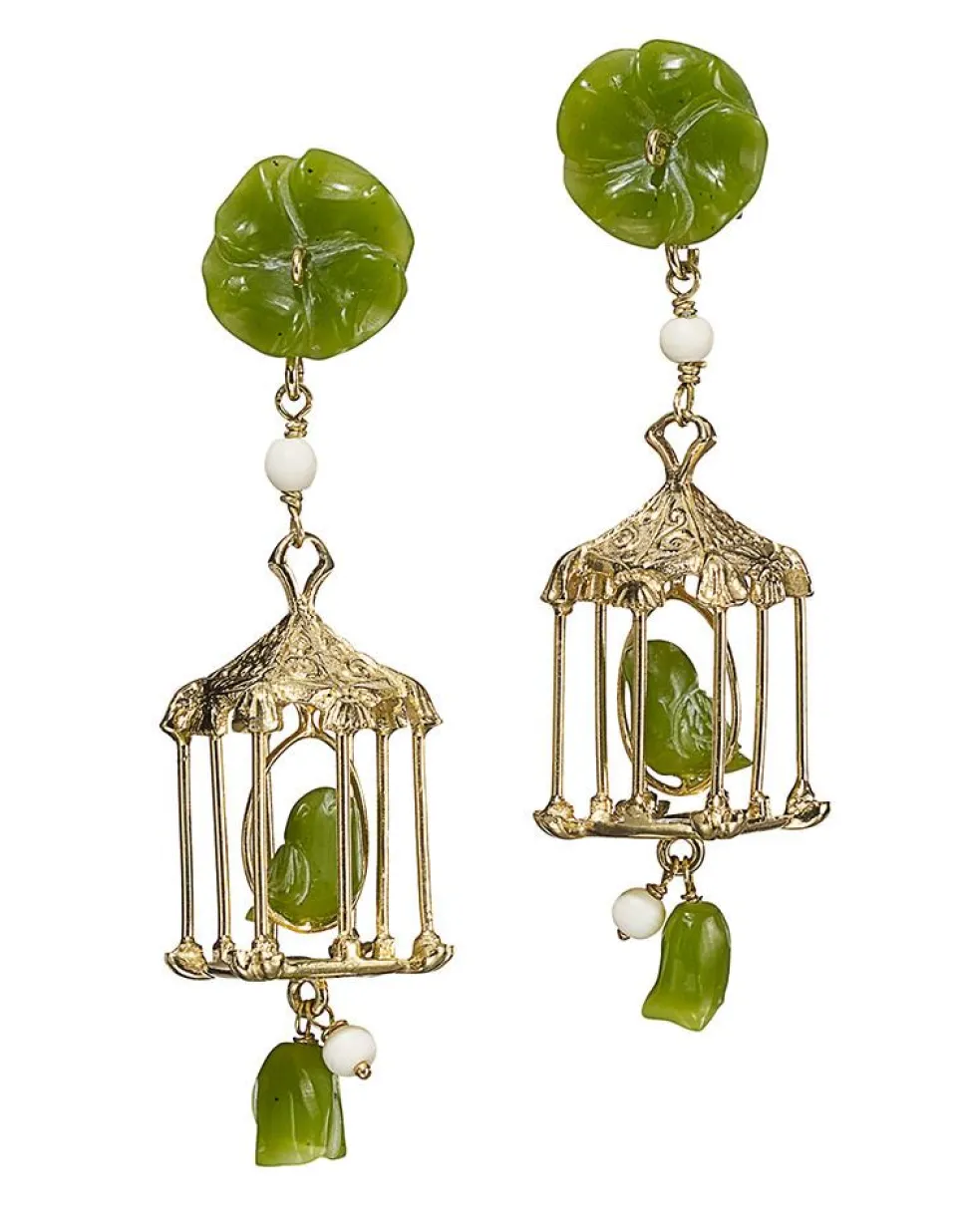 Of Rare Origin approaches jewelry as wearable poetry—at once elegant and intriguing. Fusing creative curiosity, resourcefulness, and international heritage, mother and daughter, Leslie and Octavia launched this New York City-based brand in March 2016, combining thirty years of experience in the jewelry, design, and arts industries. These handmade Pagoda Earrings in Gold feature a birdcage adorned with jade and white agate.