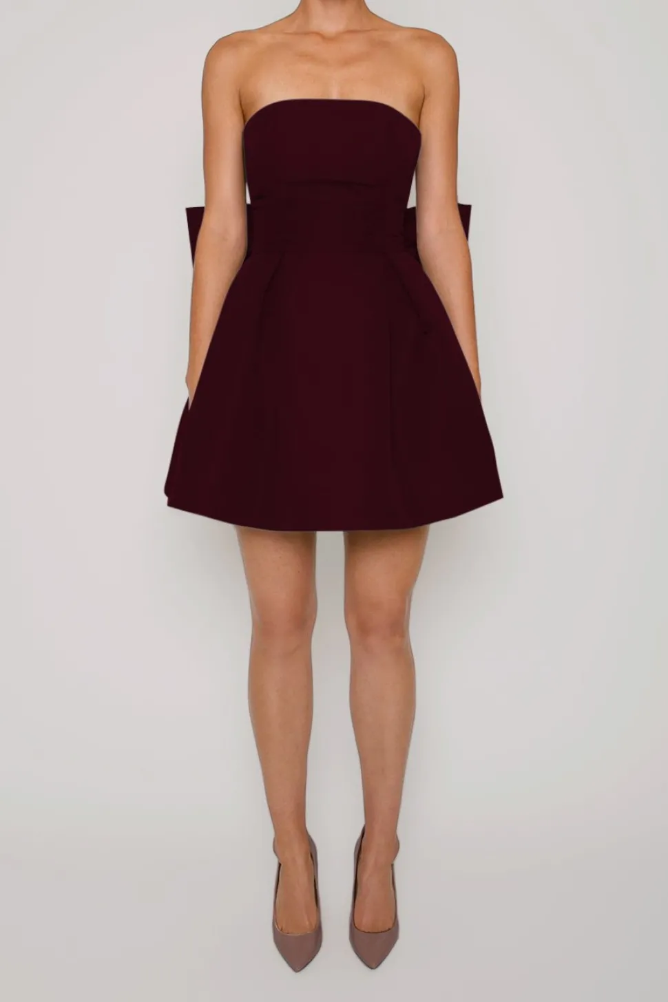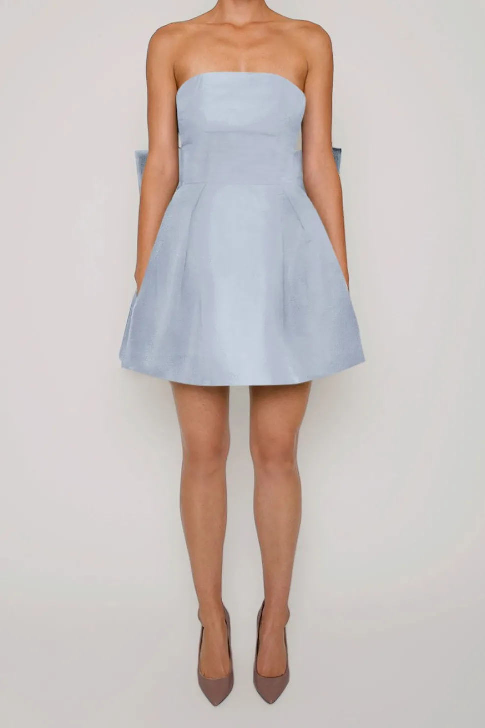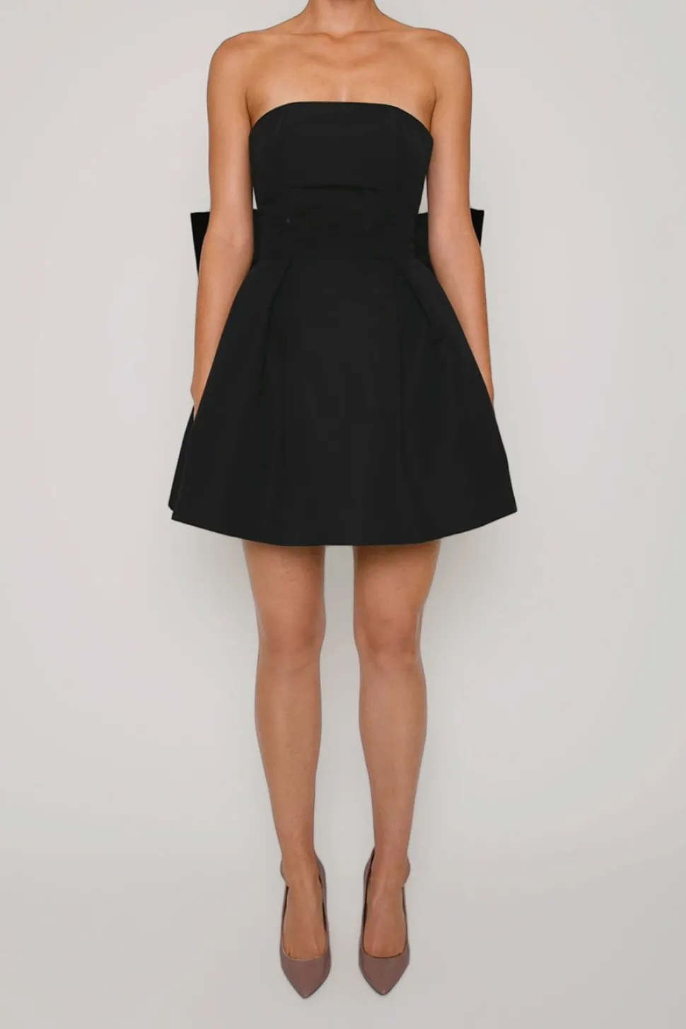 Silk Faille. Fully lined. Shell: 100% Silk. Lining: 100% Polyester. Straight strapless neckline. Fitted bodice with boning for support. Seam at natural waist. Oversized back bow. Pleated full mini skirt with side seam pockets. Made in the USA.