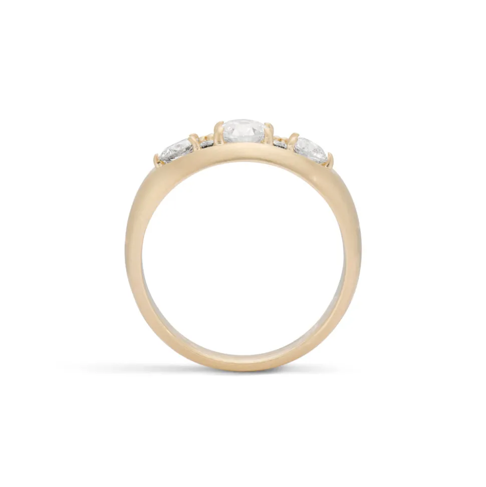 14 karat yellow gold. Approximately 0.33-0.35 carats of Old Mine Cut Diamond center, VS/SI clarity, G/H color. Approximately 0.30-0.32 total carat weight of Old Mine Cut Diamond sides, VS/SI clarity, G/H color. Approximately 0.07 total carat weight of petite Modern Round Brilliant Diamond accents, VS/SI clarity, G/H color.