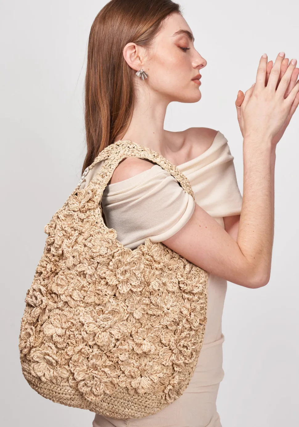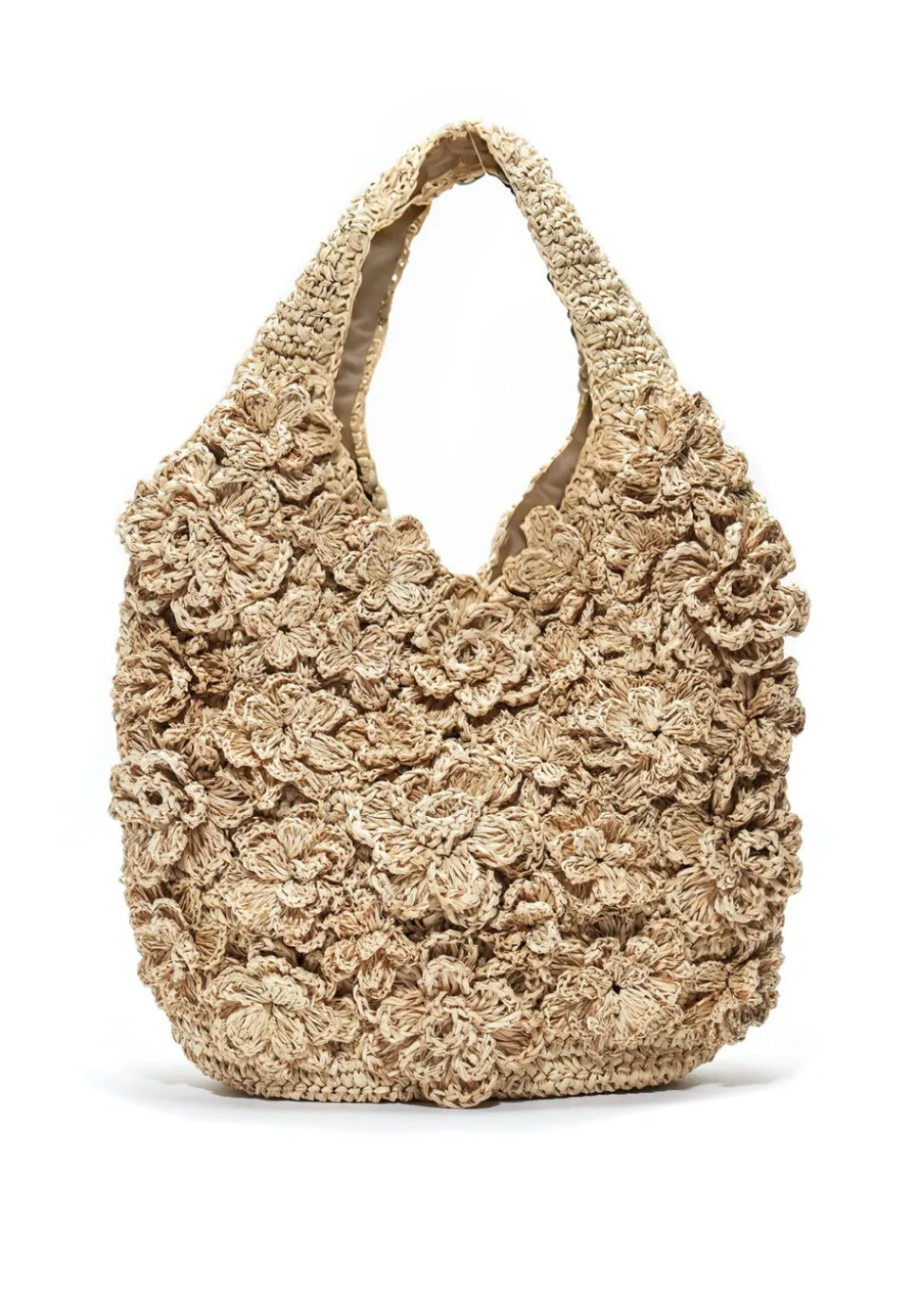 Natural raffia, raffia flowers, magnetic closure, beige matte satin interior.