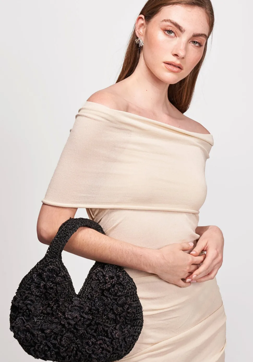 Black dyed raffia, raffia flowers, magnetic closure, black matte satin interior.