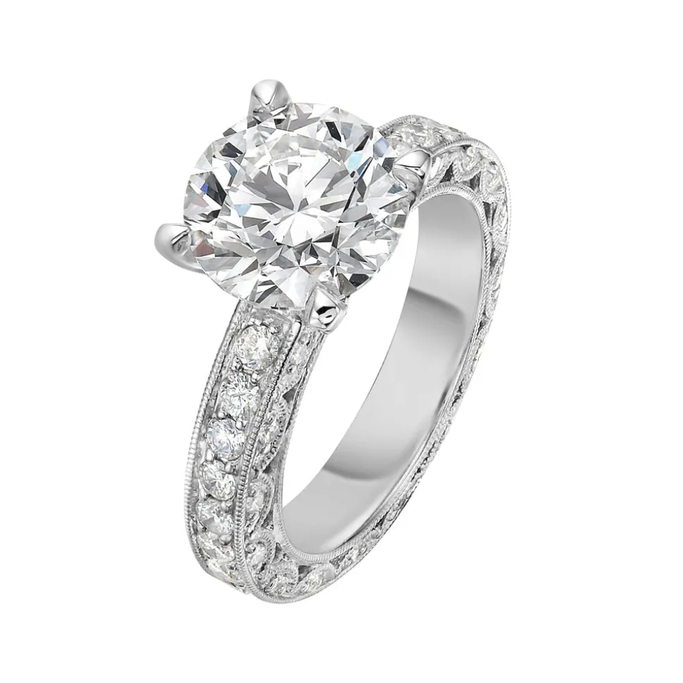 Luxury jewelry house, RUCHI New York, specializes in creating unique and versatile pieces that are exquisitely handmade and boast an heirloom quality. Crafted with precision in a variety of metals, each piece by this brand is designed to be cherished as a symbol of enduring love, whether it’s a stunning diamond ring or a timeless necklace. A modern heirloom. This engagement ring features vintage inspired band elaborately set by master jewelers and can be set with any diamond of your choice.