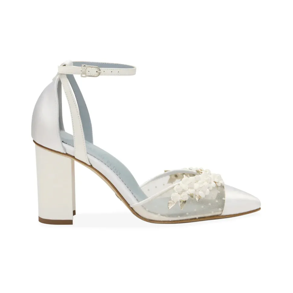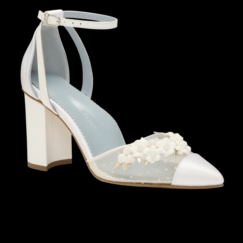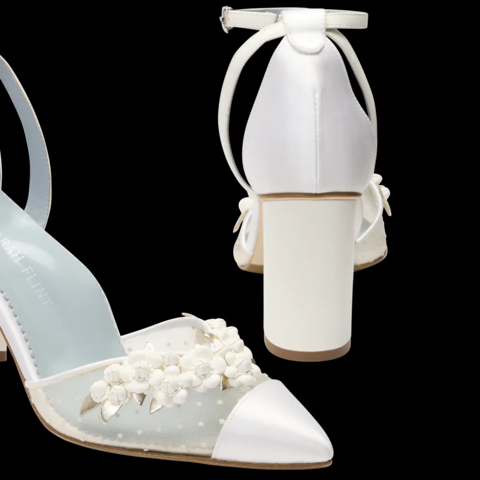 Sarah Flint sources the most exceptional materials from triple-dyed Italian suedes to jacquards woven in 300-year-old British mills. Once crafted 100% in Italy, shoes go through rounds of prototyping and fit-testing to ensure comfort and durability. The Parker 85 in White Satin is a gorgeous wedding shoe crafted in a sumptuous fabric. Featuring a D’Orsay silhouette and a polka-dot mesh vamp, the heel is accented with leather flowers.