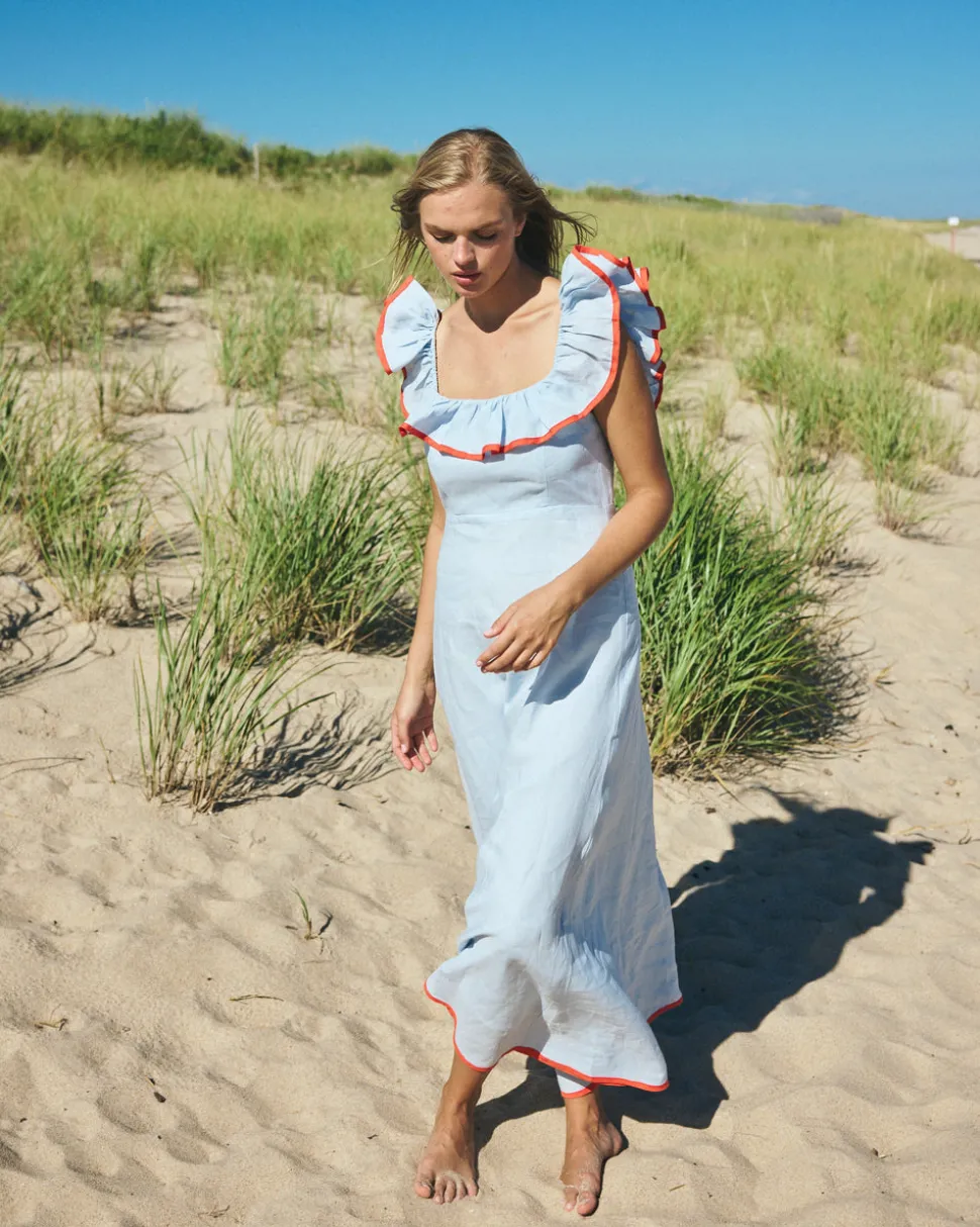 Louise New York creates its collection with the past and present in mind. Inspired by timeless glamour instead of trends, when you slip into a Louise New York dress, you carry all the confidence and carefree attitude that femininity can acclaim. The Parker Dress in Light Blue is a modern take on romance. In sky blue linen with bold, poppy-red trimmed ruffles, it brings a fresh, playful energy to any occasion—ideal for weddings, brunches, and everything in between.