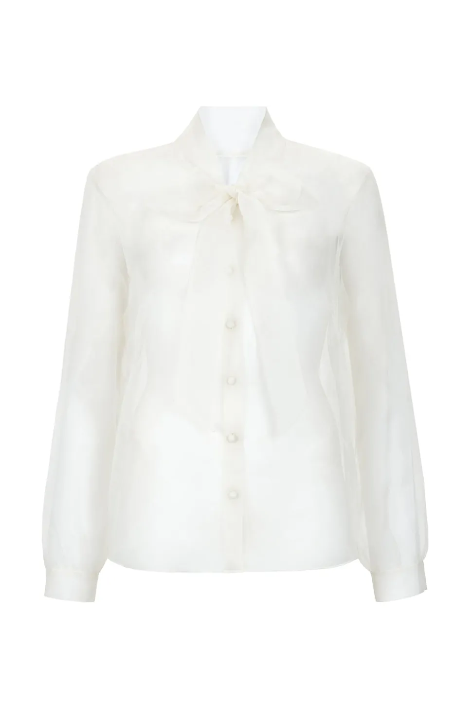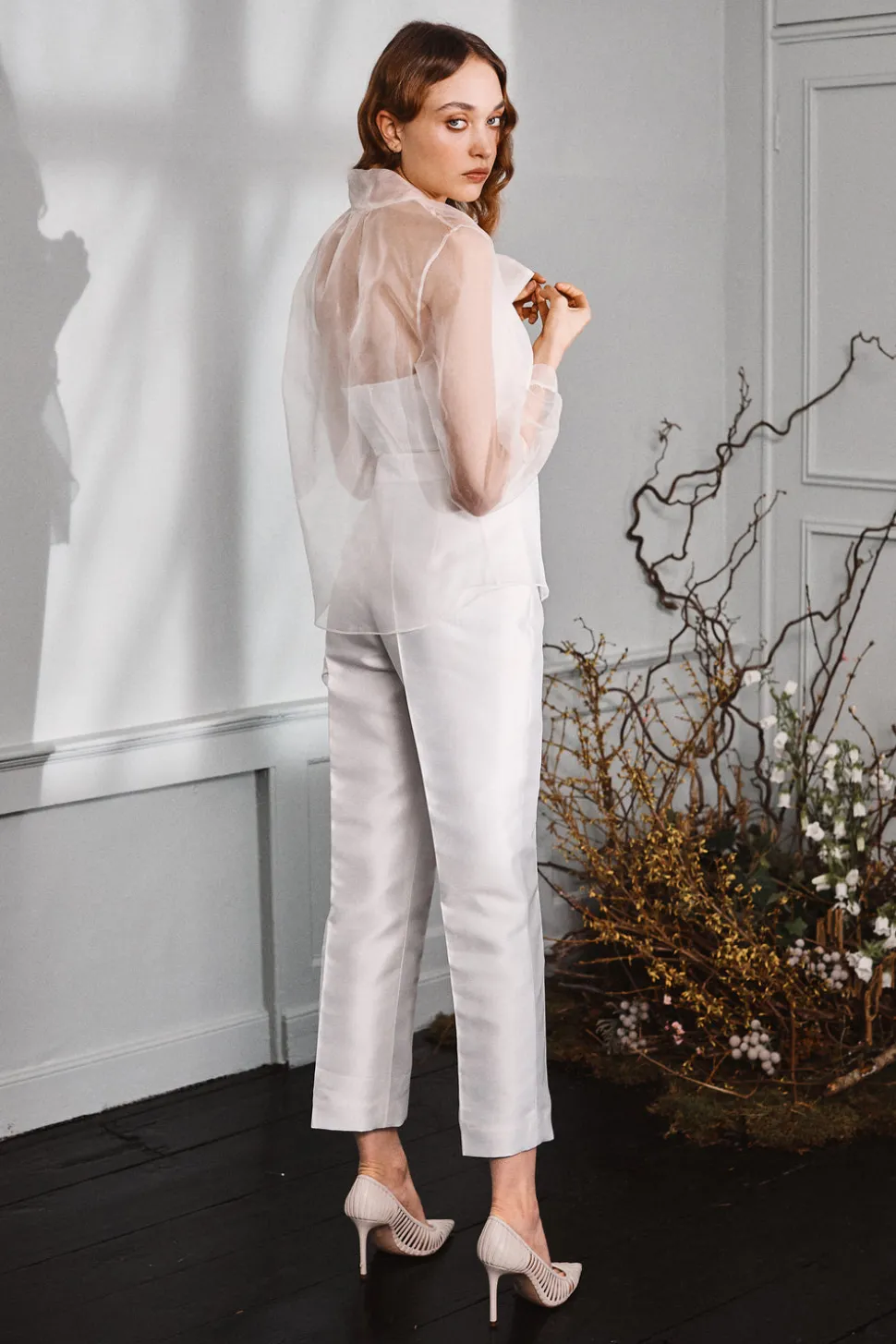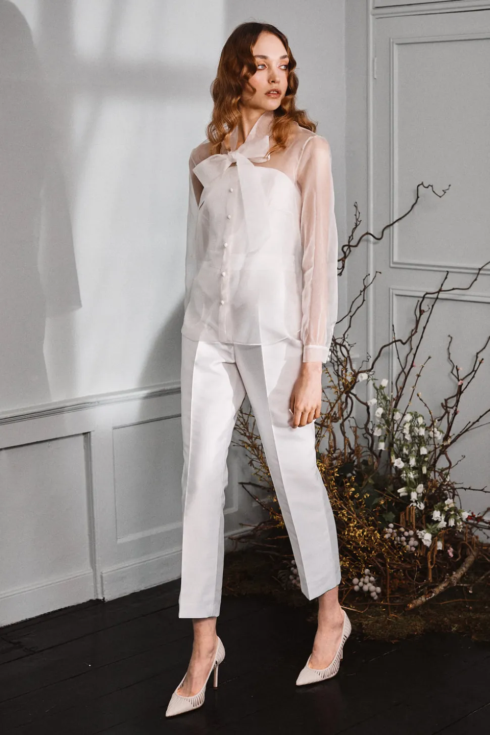 Luxury bridalwear brand Halfpenny London weaves Brit cool with a luxe sensibility, creating innovative, chic dresses and separates for the modern woman. The Parry Shirt is for women who love to layer, even in the warmer seasons. This silk organza button-up blouse with a pussy-bow detail can be dressed up, dressed down, and transitioned from day to night easily—it’s all about the styling, but the possibilities are endless.