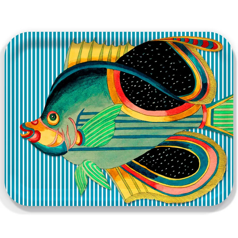 Caskata makes dinnerware for those who love to entertain. That joie de vivre and celebratory atmosphere makes its way into each piece of the brand’s blend of classic and contemporary designs, recognizable by their creative patterns, enduring quality, and light touch. This Party Fish Large Rectangular Birchwood Tray brings a vibrant, slightly mischievous attitude, coupled with a vivid pop of color, to play with jaunty sea-green stripes on a big, generous tray.