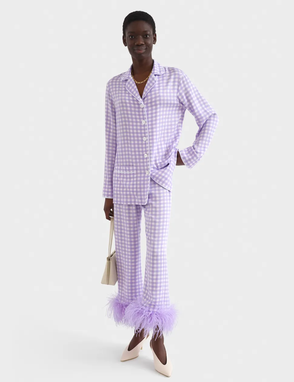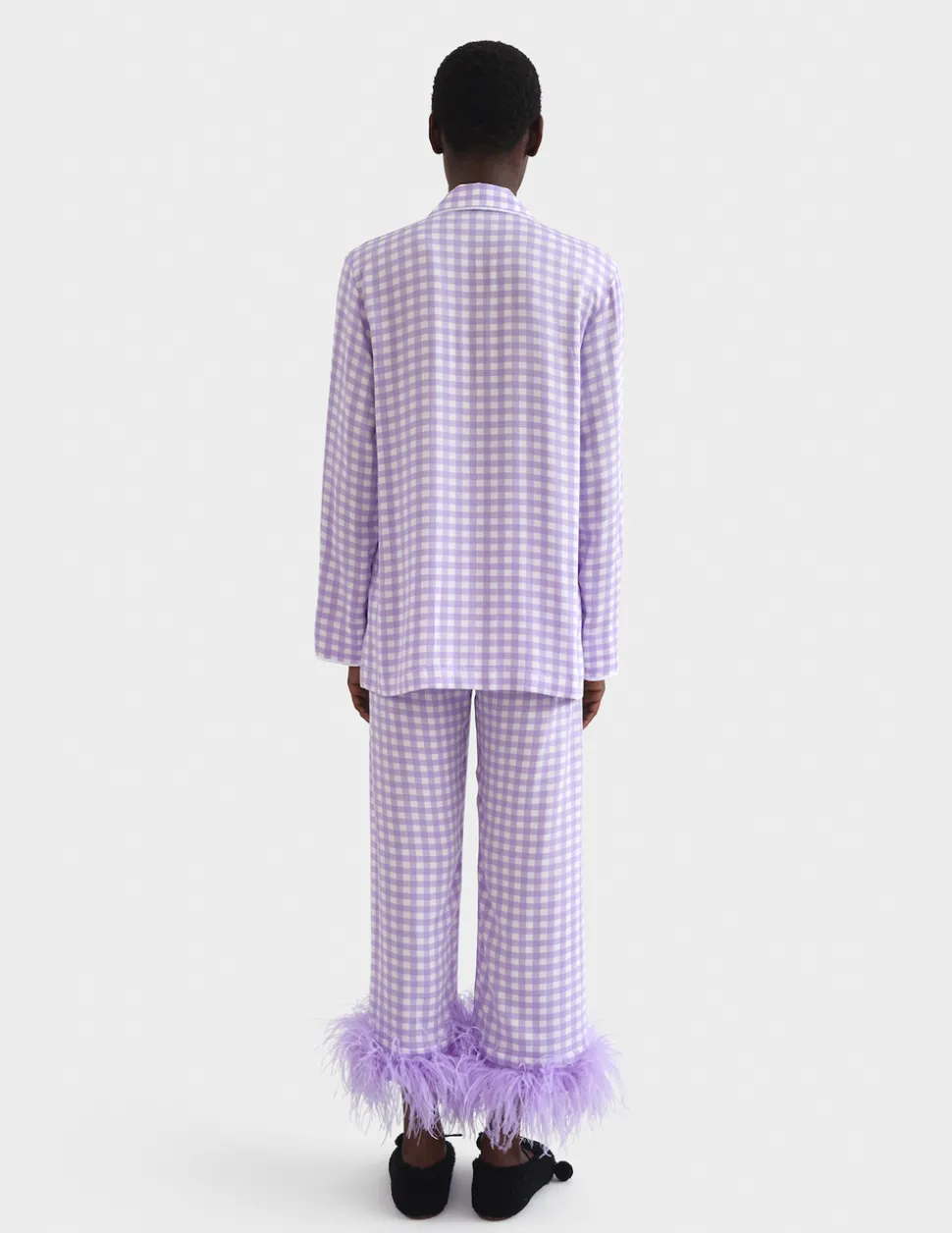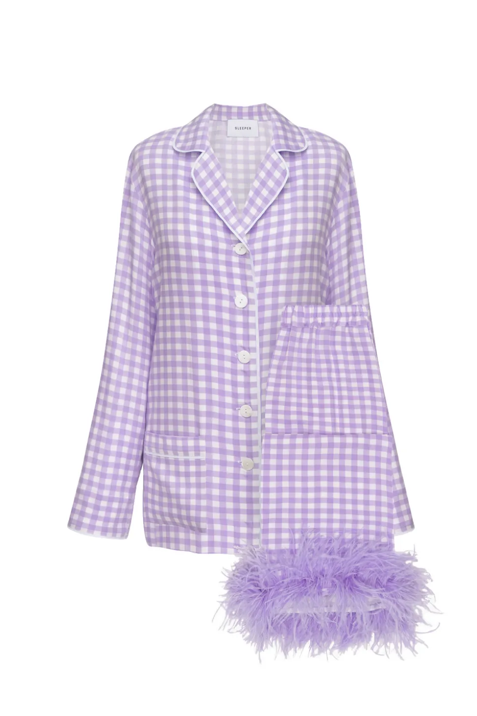 This sleepwear set belongs in every aesthete’s nighttime wardrobe. The “Party Pajama” features one of the most iconic Sleeper silhouettes in a vivid Lavender Vichy pattern. Thoroughly chic yet modernly practical, the Party Pajama is even equipped with detachable feathers.
