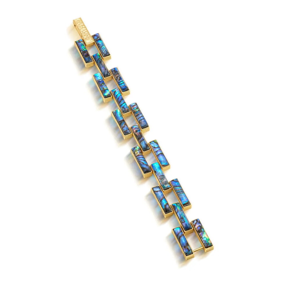 Half-Parisian, half-Texan, Capucine De Wulf’s unique upbringing was the inspiration for her namesake jewelry line. Her accessories combine French romance with an American sensibility. The Pathway Link Bracelet in Abalone reimagines the road less traveled with luminous abalone shell inlays set within gleaming gold links. Its bold geometric design celebrates individuality and self-discovery, adding a radiant touch to any ensemble.