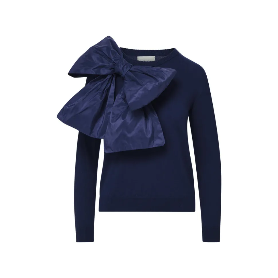 MAE New York seeks to revitalize New York’s historical garment district by creating small-batch and made-to-order collections—modern interpretations of 1960s glamor—highlighting tailoring, luxury materials, and craftsmanship. Finely knitted in merino wool, this statement sweater features the signature MAE silk taffeta hand stitched bow.