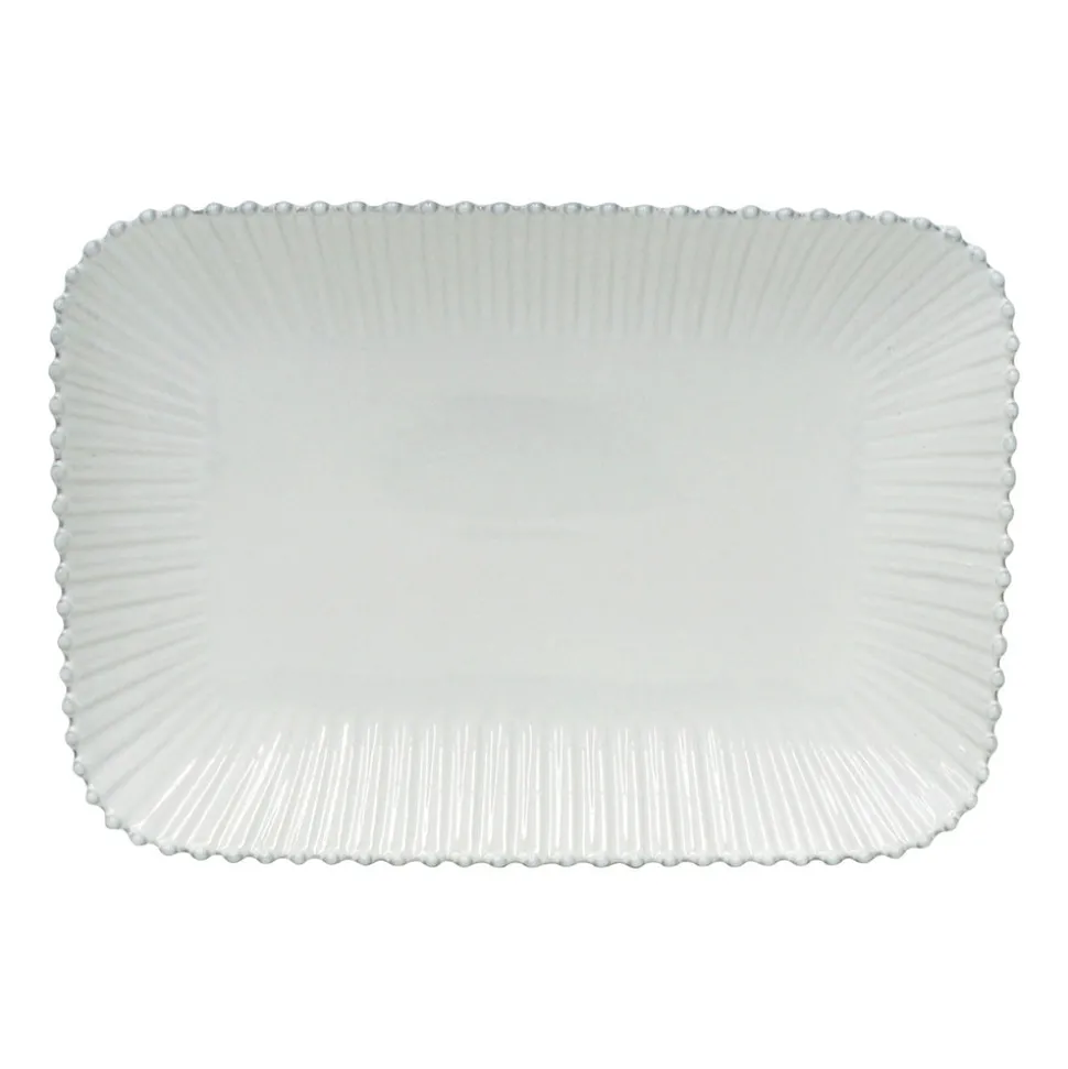 Costa Nova originated in a small Portuguese fishing village by the Atlantic Ocean. Carrying the name and heritage of Portugal worldwide, the brand creates fine stoneware collections that blend design, quality, and exceptional ceramic craftsmanship. The Pearl Collection Rectangle Platter 16″ in White features a classically embossed beaded border and elongated shape, making it a graceful addition to festive gatherings and everyday serving.