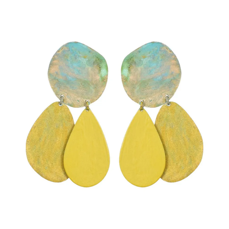 Founded in 2002 by designer Jade Gedeon, We Dream In Colour is powered by a team of women at their North Shore studio in Boston. Each piece of jewelry is assembled by hand, and the company works hard to operate in a socially conscious fashion every step of the way while creating their whimsical, elegant designs. The Pebble Earrings feature washes of chartreuse and metallic gold pigment that add depth to a natural patina.