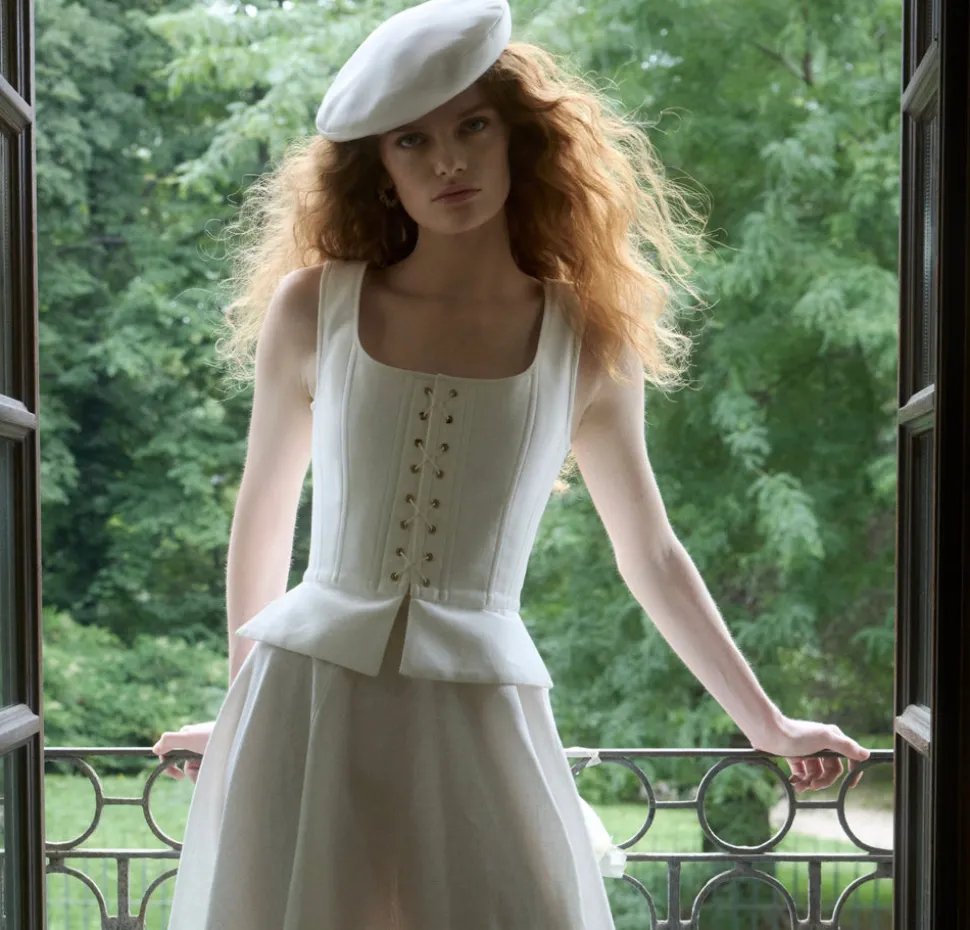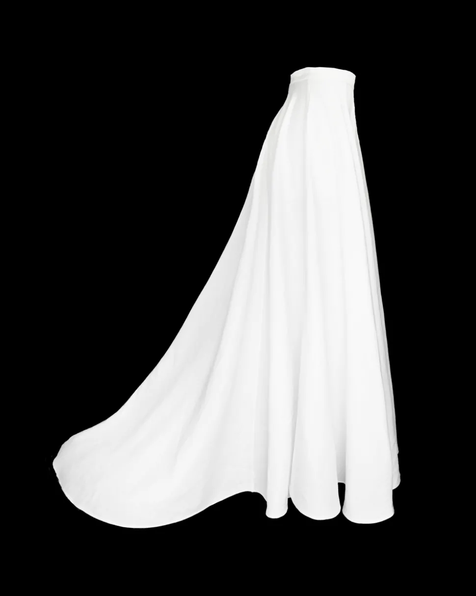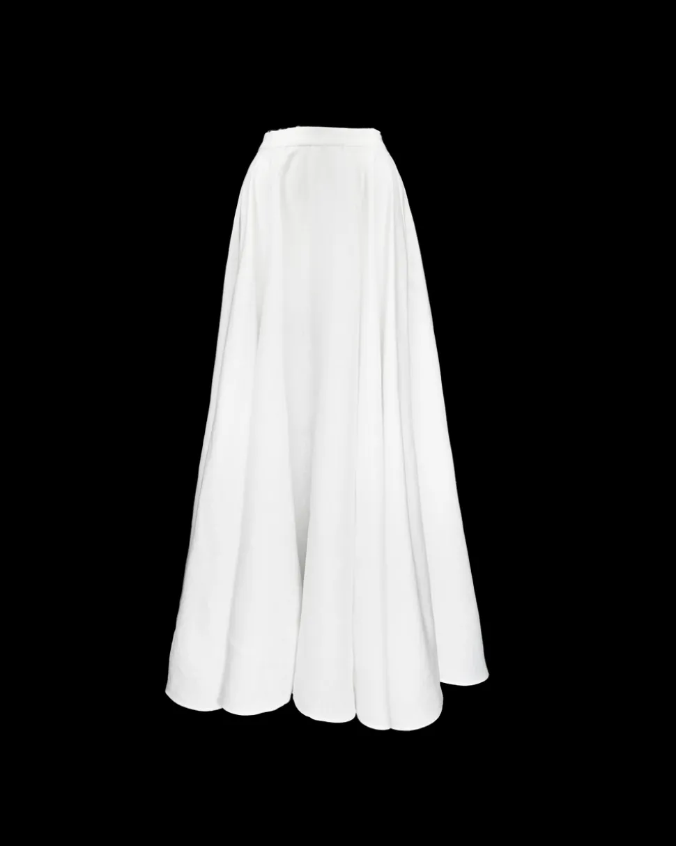 Milanese designer Alice Pons looks to traditional corsets, based on original historical designs, and transforms them into thoroughly contemporary pieces through bold and innovative design. The Peplum Corset is a 20th-century bustier featuring a flattering square neckline and a peplum hem. Adjustable back lacing allows the corset to be gradually tightened, ensuring a flattering fit. The Circle Skirt covers the body from the waist down to the toes and features soft drapes created by its circular volume and a small train in the back. The flowy, flouncy A-line silhouette adds volume and movement to the skirt. The skirt has an invisible back zip closure for easy fastening and a comfortable high-waisted fit.