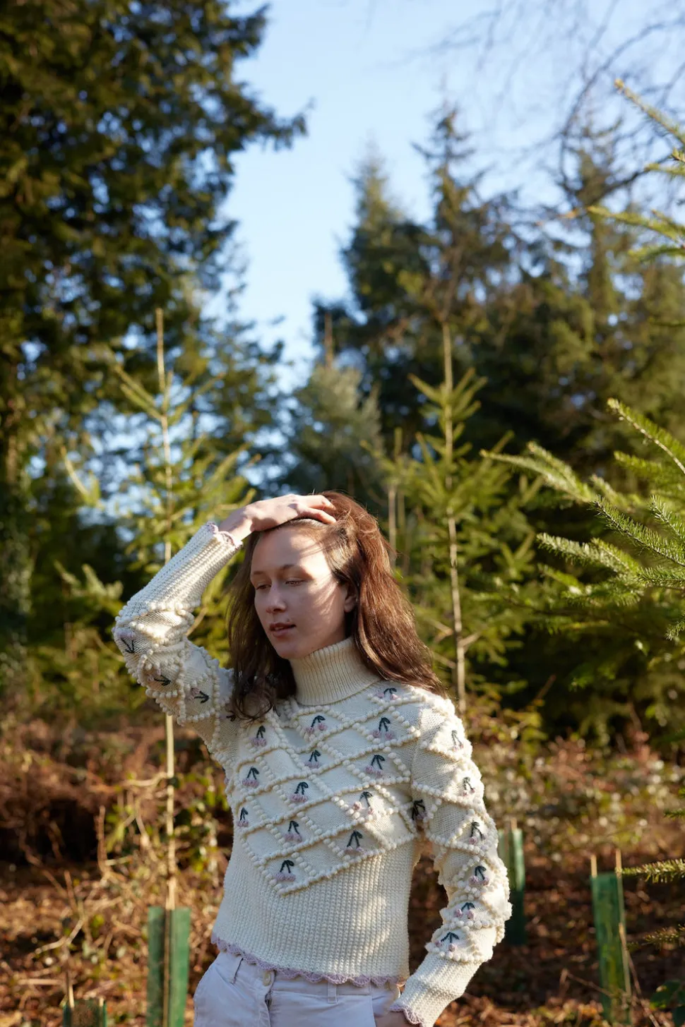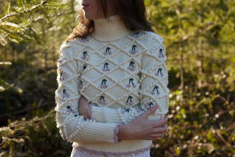 From her studio in France, Michaela Buerger brings a contemporary lens to the rich cultural knitting traditions of her Austrian homeland, designing ultra-feminine, high-quality, everlasting pieces that are handmade in partnership with communities of women across Eastern Europe. Adorned with a charming tracht bobble knit, delicate red crochet borders, and charming cherry embroideries, this chic-casual design is hand-knitted and hand-embroidered to perfection. Keep cozy and stylish during the winter season with this one-of-a-kind piece.